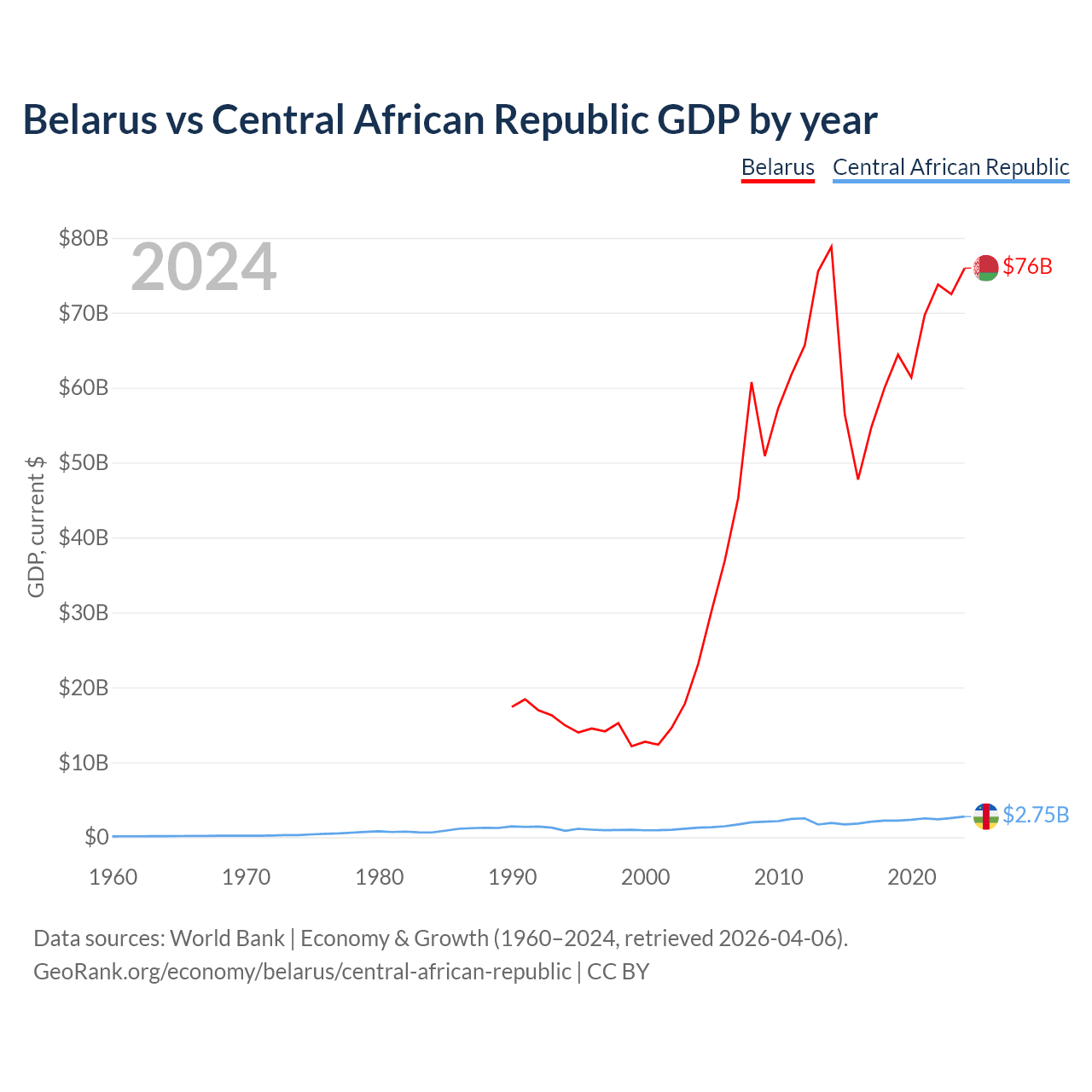 Belarus has a GDP of $76B compared to $2.75B for the Central African Republic, ranking 83/197 and 171/197 by economy size, respectively.