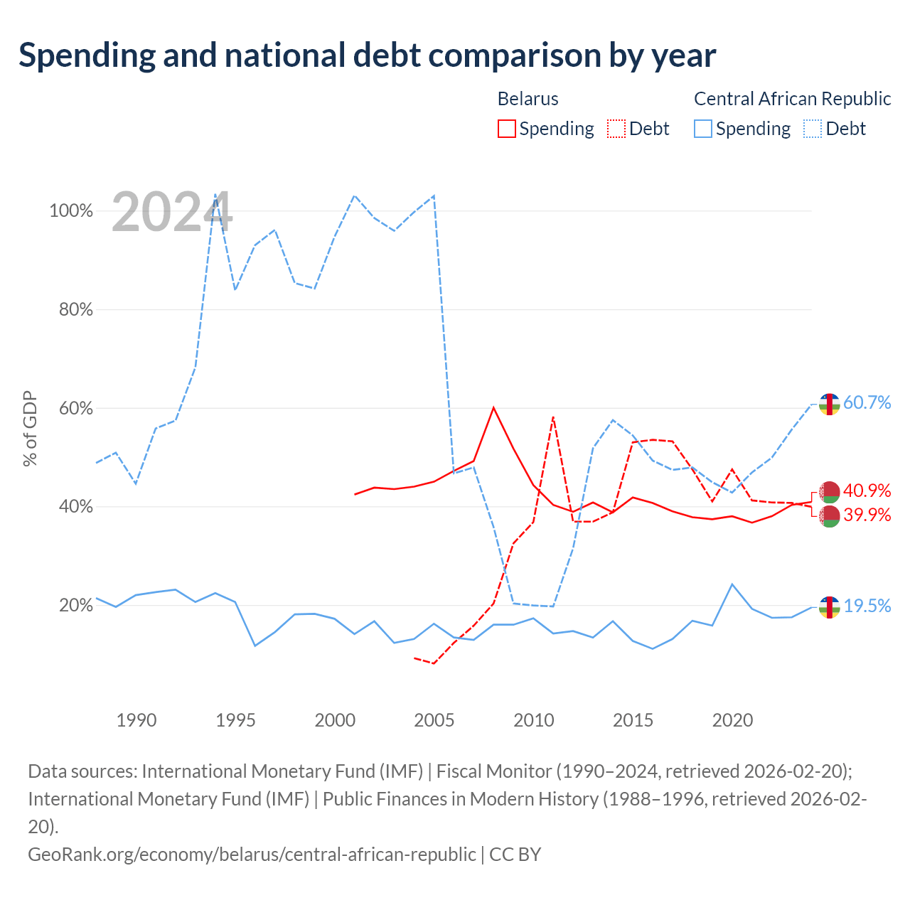 Belarus has $30.3B in government debt (39.9% of GDP), compared to $1.67B (60.7% of GDP) in the Central African Republic.