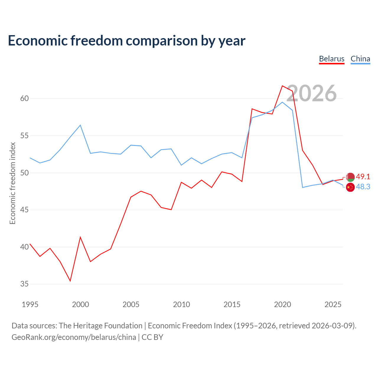 The Economic Freedom Index for Belarus is 49.1, ranking 166/197, compared to 48.3 for China, ranking 170/197. The chart above displays a comparison of annual changes in economic freedom indexes.