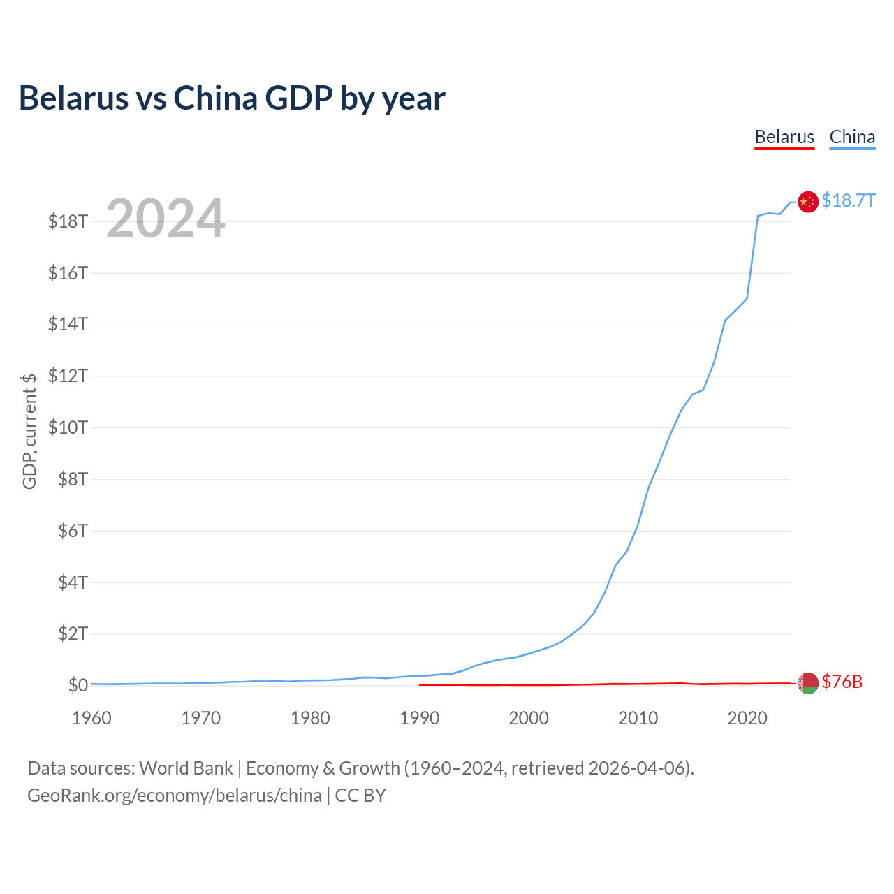 Belarus has a GDP of $76B compared to $18.7T for China, ranking 83/197 and 2/197 by economy size, respectively.