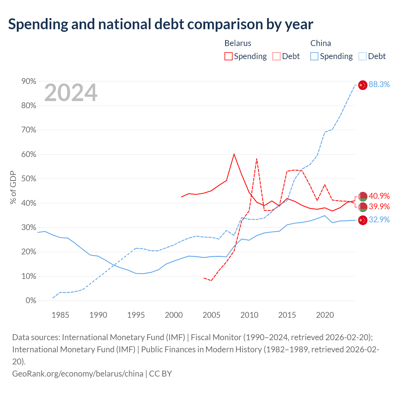 Belarus has $30.3B in government debt (39.9% of GDP), compared to $16.6T (88.3% of GDP) in China.