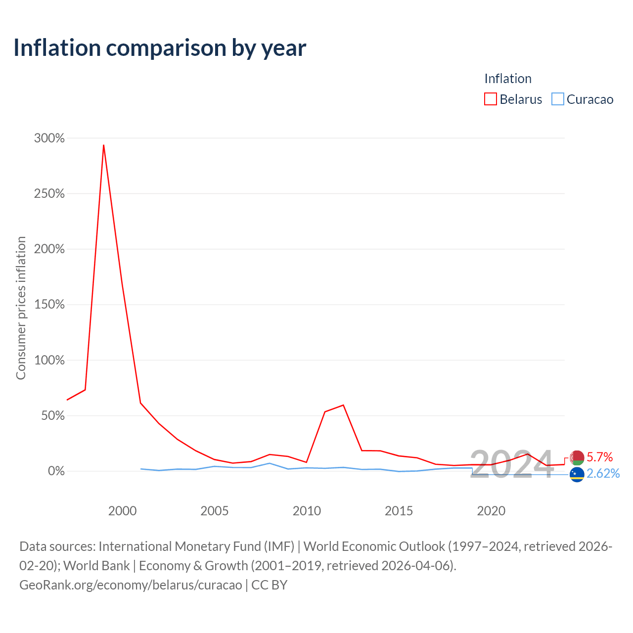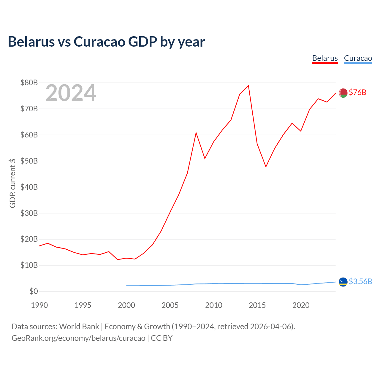 Belarus has a GDP of $76B compared to $3.56B for Curacao, ranking 83/197 and 167/197 by economy size, respectively.