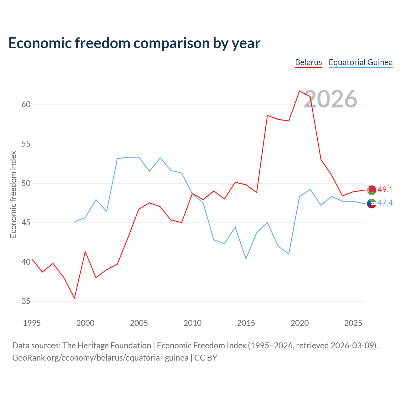 The Economic Freedom Index for Belarus is 49.1, ranking 166/197, compared to 47.4 for Equatorial Guinea, ranking 175/197. The chart above displays a comparison of annual changes in economic freedom indexes.