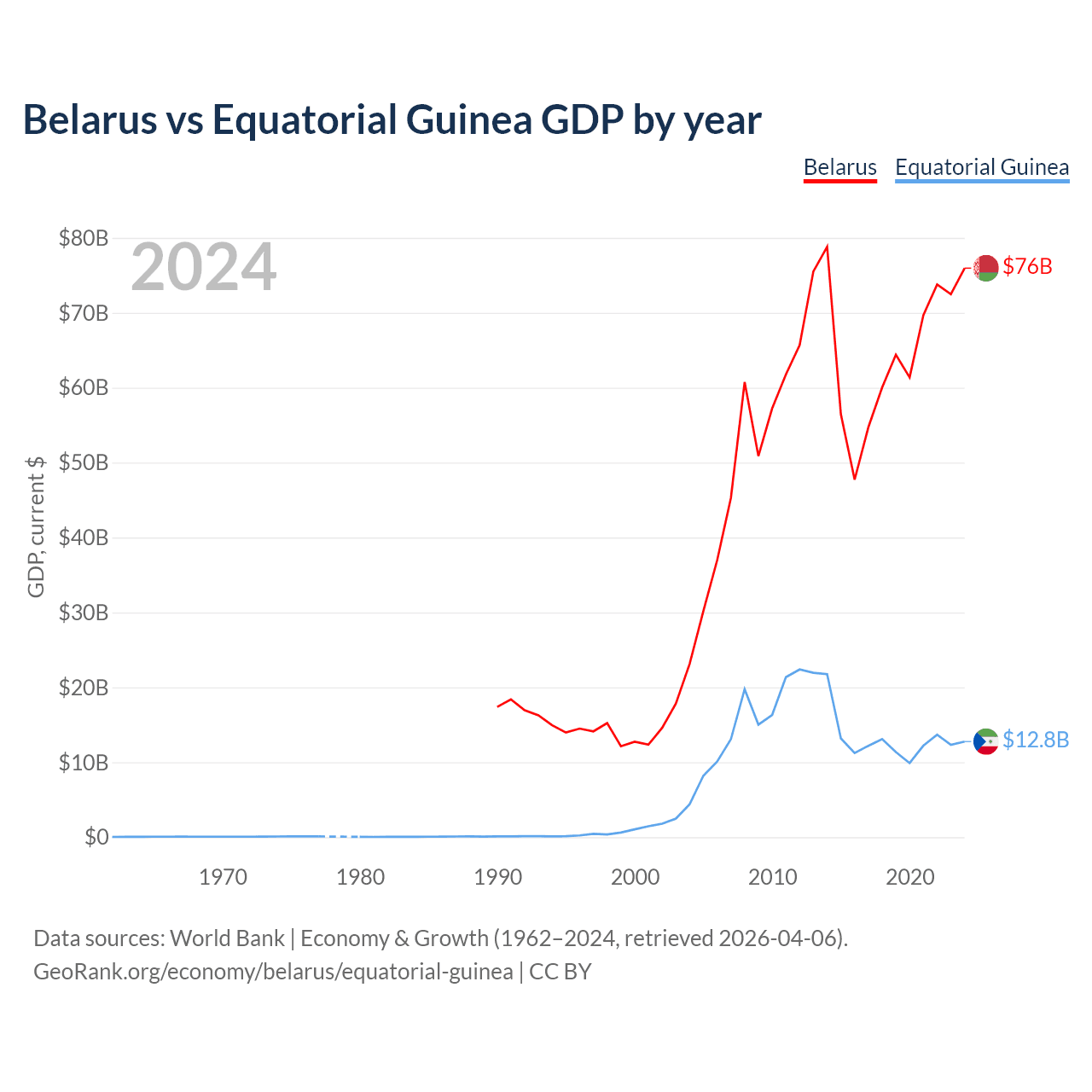 Belarus has a GDP of $76B compared to $12.8B for Equatorial Guinea, ranking 83/197 and 148/197 by economy size, respectively.