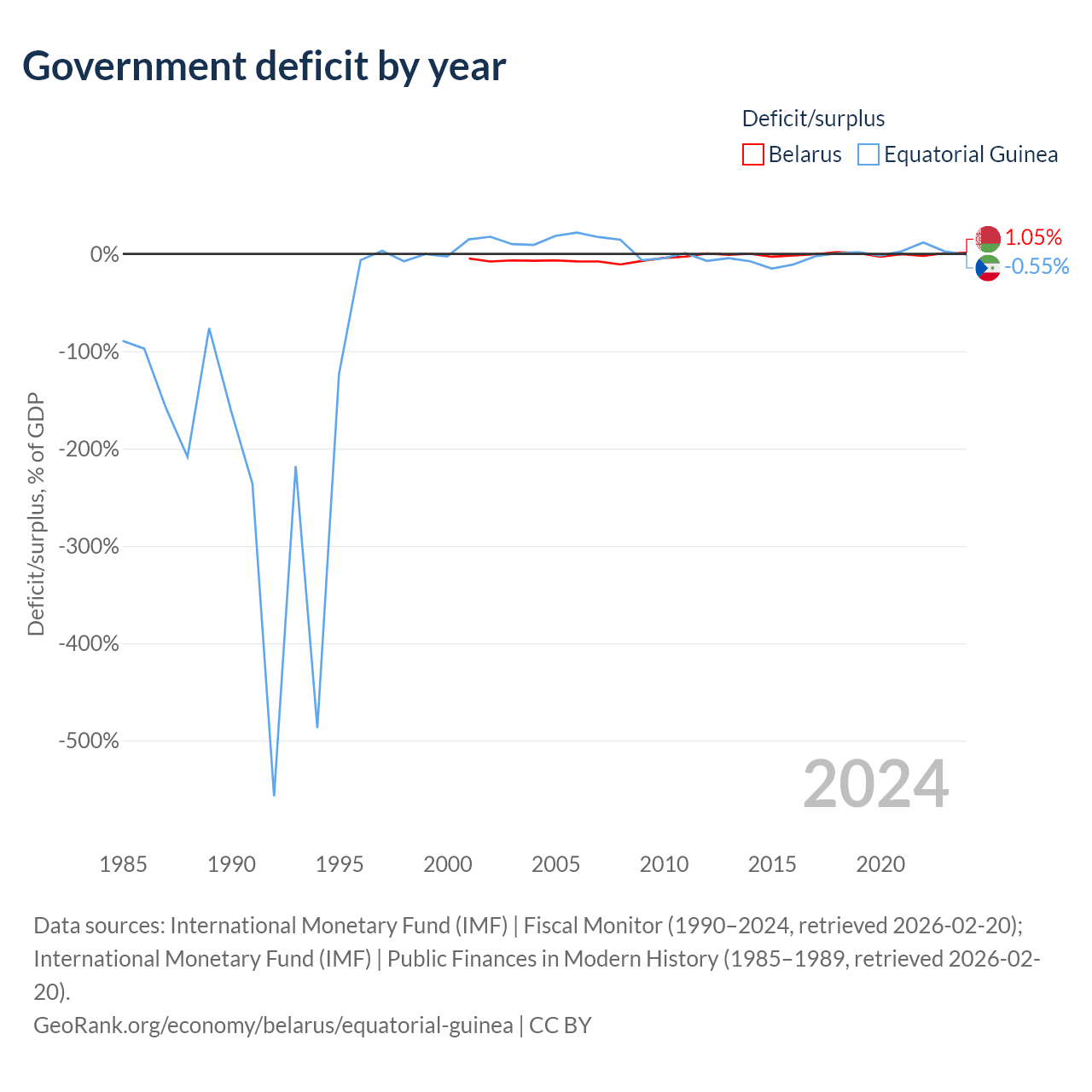 Belarus has $30.3B in government debt (39.9% of GDP), compared to $4.65B (36.4% of GDP) in Equatorial Guinea.