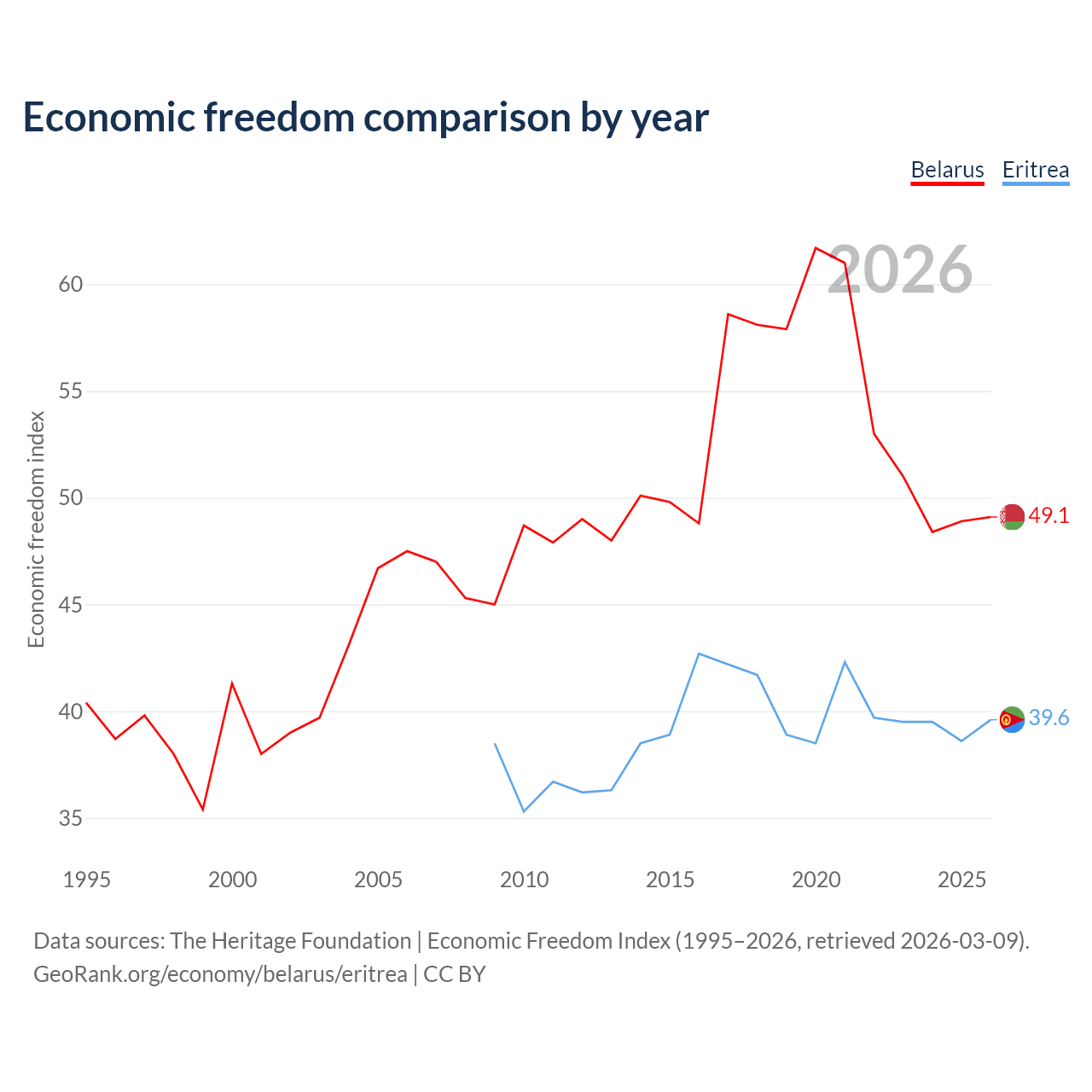 The Economic Freedom Index for Belarus is 49.1, ranking 166/197, compared to 39.6 for Eritrea, ranking 188/197. The chart above displays a comparison of annual changes in economic freedom indexes.