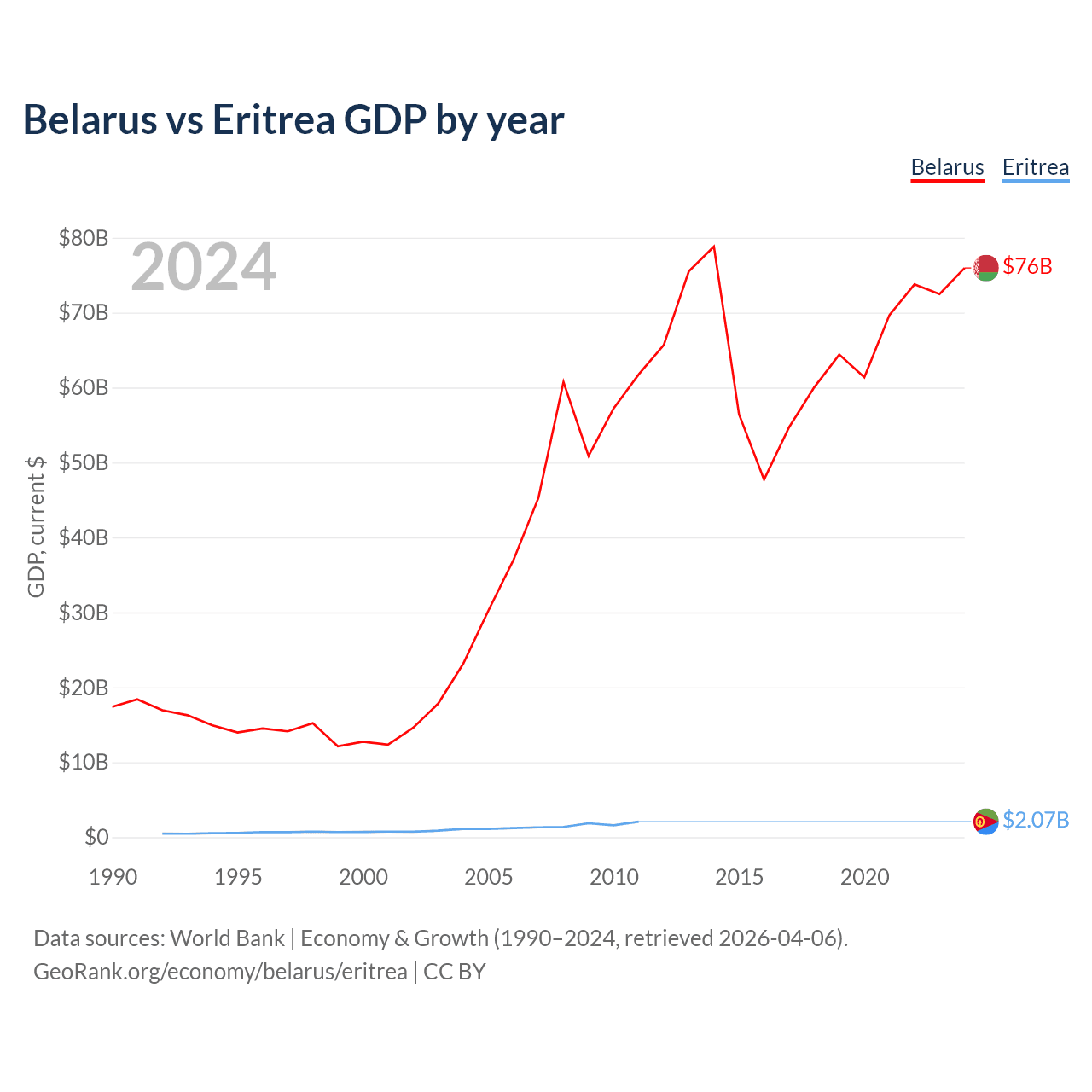 Belarus has a GDP of $76B compared to $2.07B for Eritrea, ranking 83/197 and 179/197 by economy size, respectively.