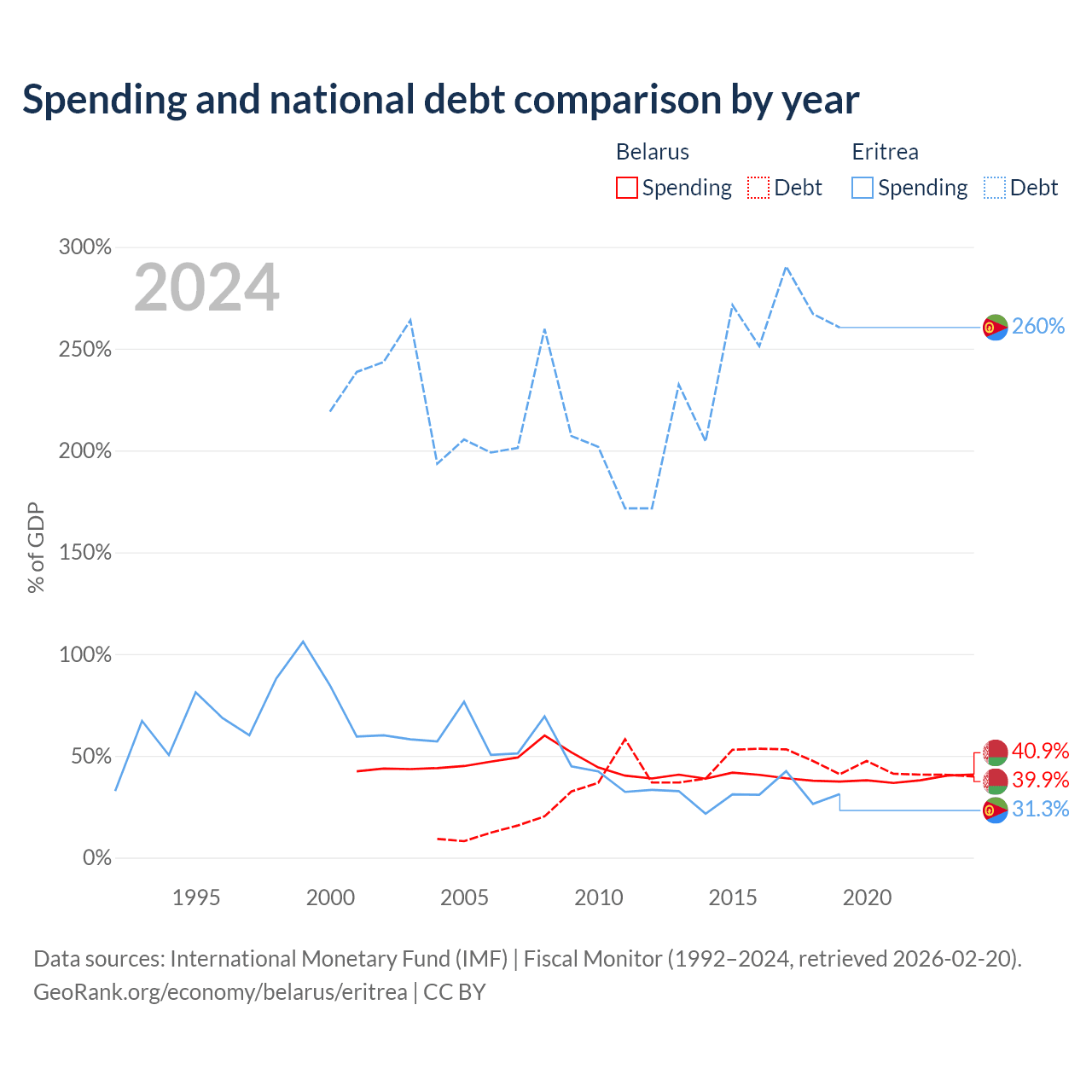 Belarus has $30.3B in government debt (39.9% of GDP), compared to $3.54B (260.4% of GDP) in Eritrea.