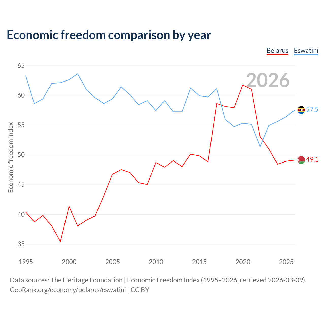 The Economic Freedom Index for Belarus is 49.1, ranking 166/197, compared to 57.5 for Eswatini, ranking 116/197. The chart above displays a comparison of annual changes in economic freedom indexes.