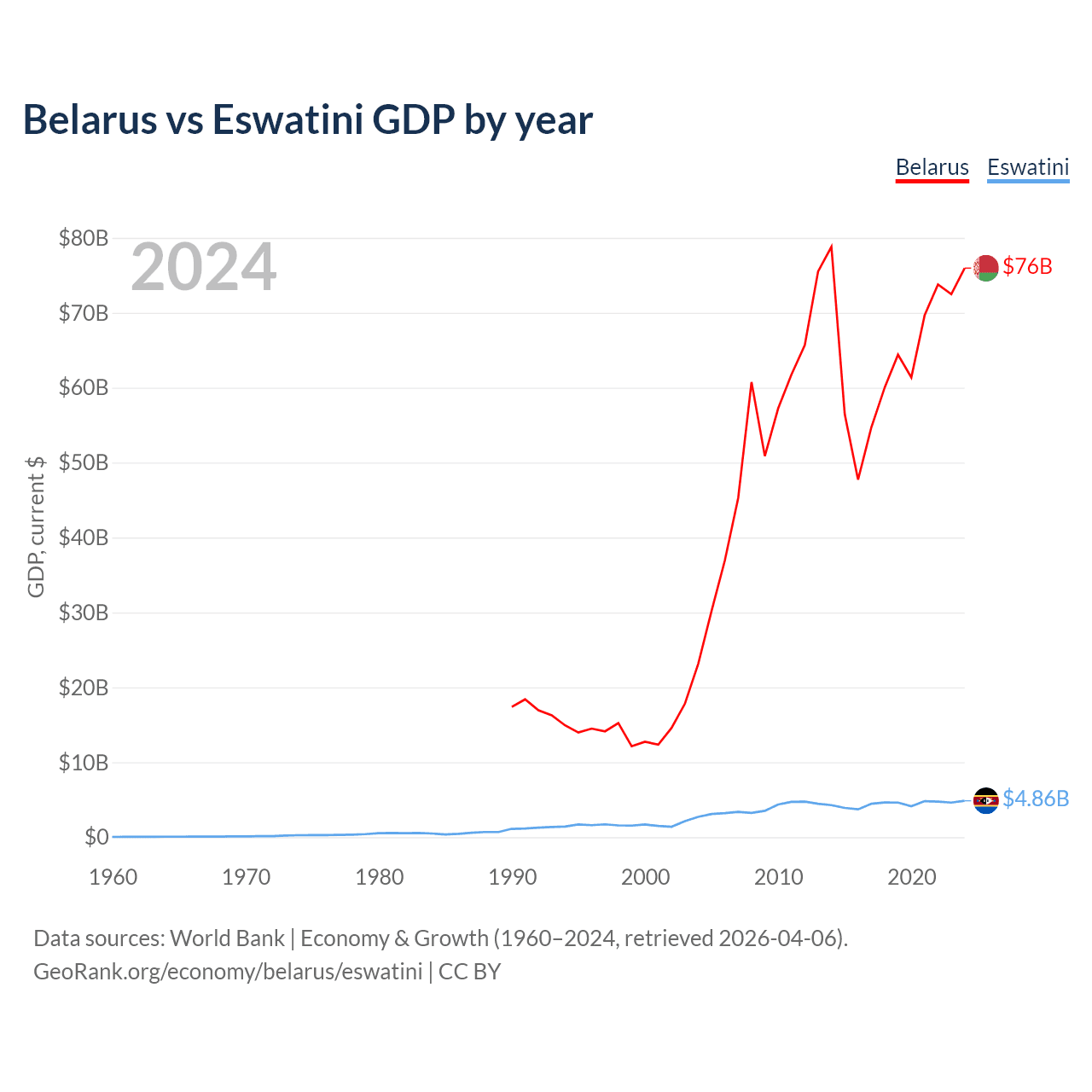Belarus has a GDP of $76B compared to $4.86B for Eswatini, ranking 83/197 and 162/197 by economy size, respectively.