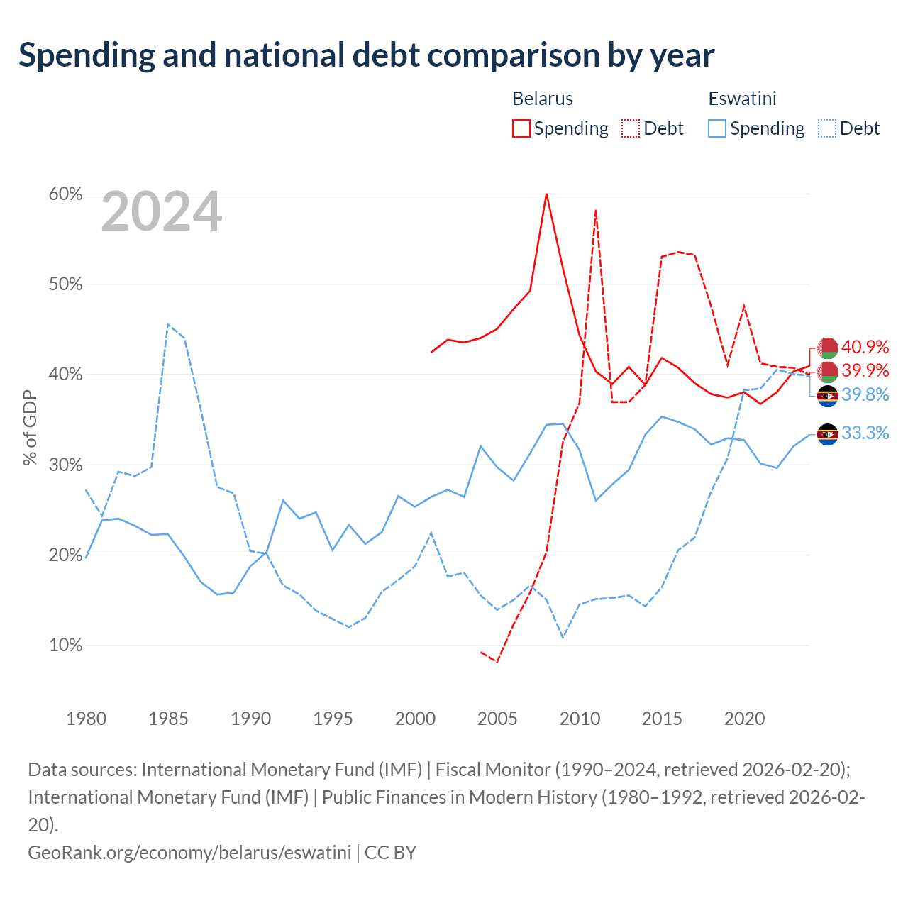 Belarus has $30.3B in government debt (39.9% of GDP), compared to $1.93B (39.8% of GDP) in Eswatini.