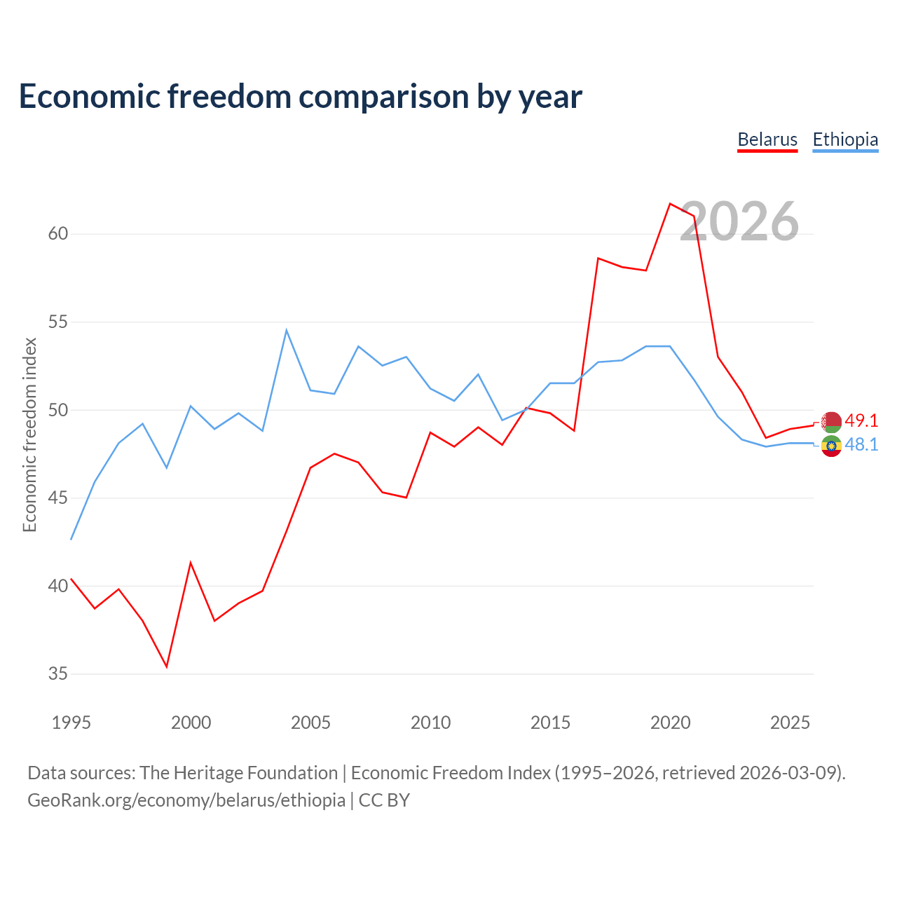 The Economic Freedom Index for Belarus is 49.1, ranking 166/197, compared to 48.1 for Ethiopia, ranking 171/197. The chart above displays a comparison of annual changes in economic freedom indexes.