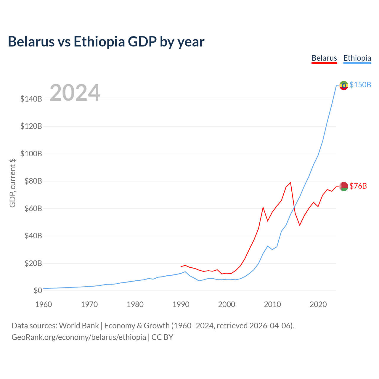 Belarus has a GDP of $76B compared to $150B for Ethiopia, ranking 83/197 and 60/197 by economy size, respectively.