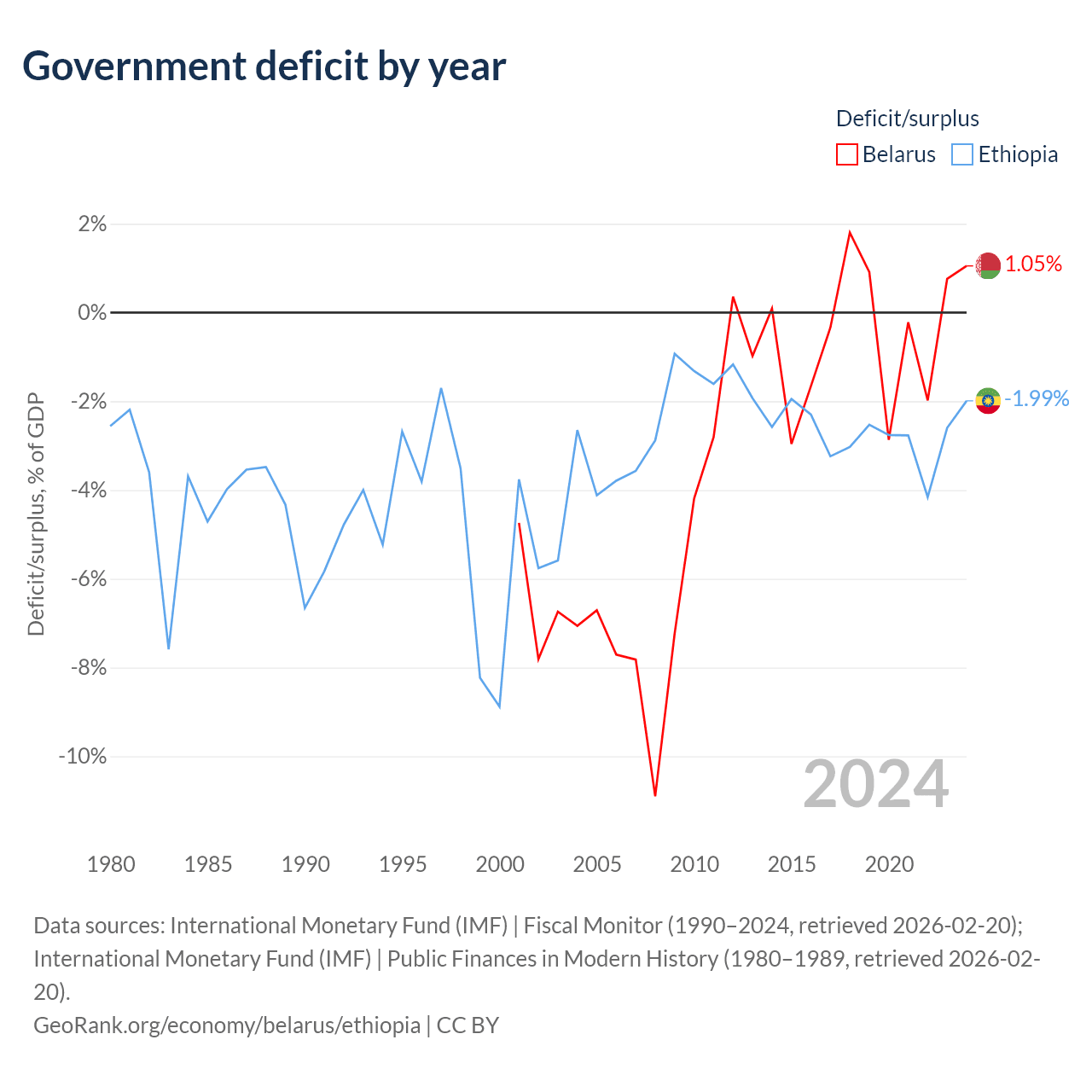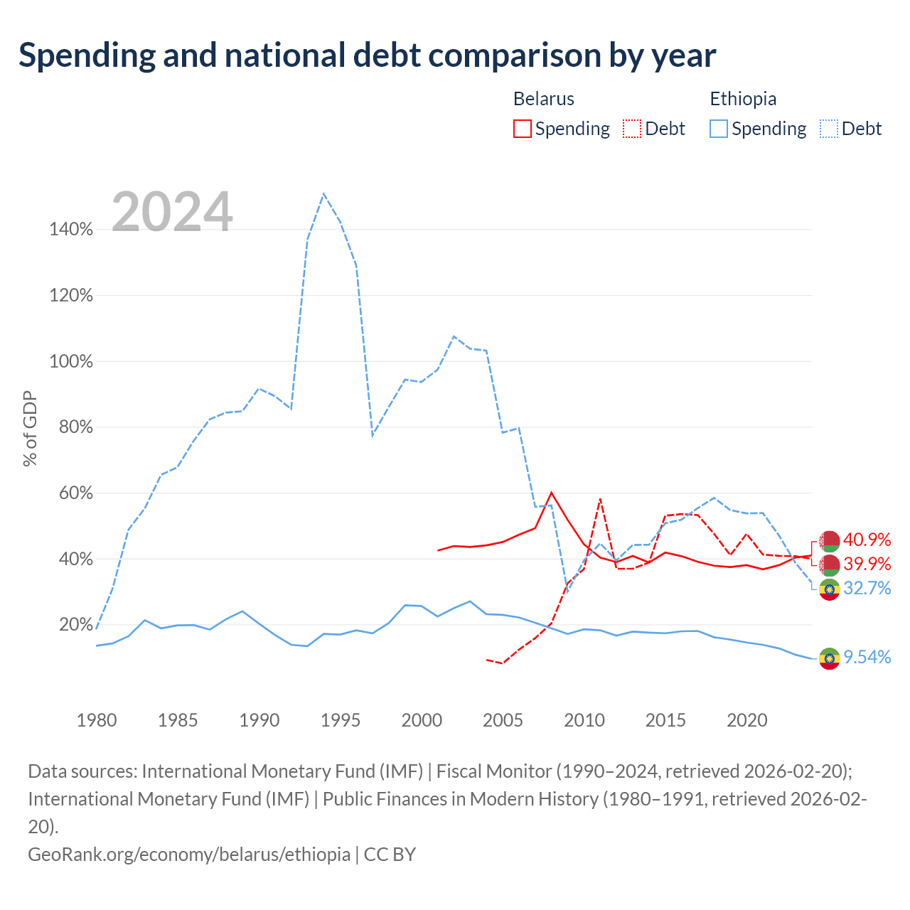 Belarus has $30.3B in government debt (39.9% of GDP), compared to $48.9B (32.7% of GDP) in Ethiopia.