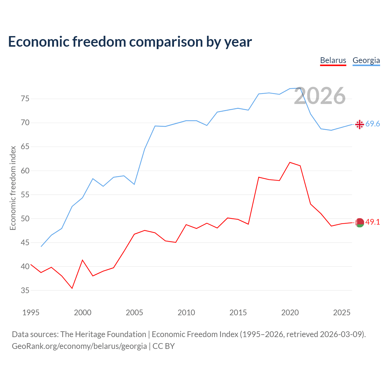 The Economic Freedom Index for Belarus is 49.1, ranking 166/197, compared to 69.6 for Georgia, ranking 41/197. The chart above displays a comparison of annual changes in economic freedom indexes.