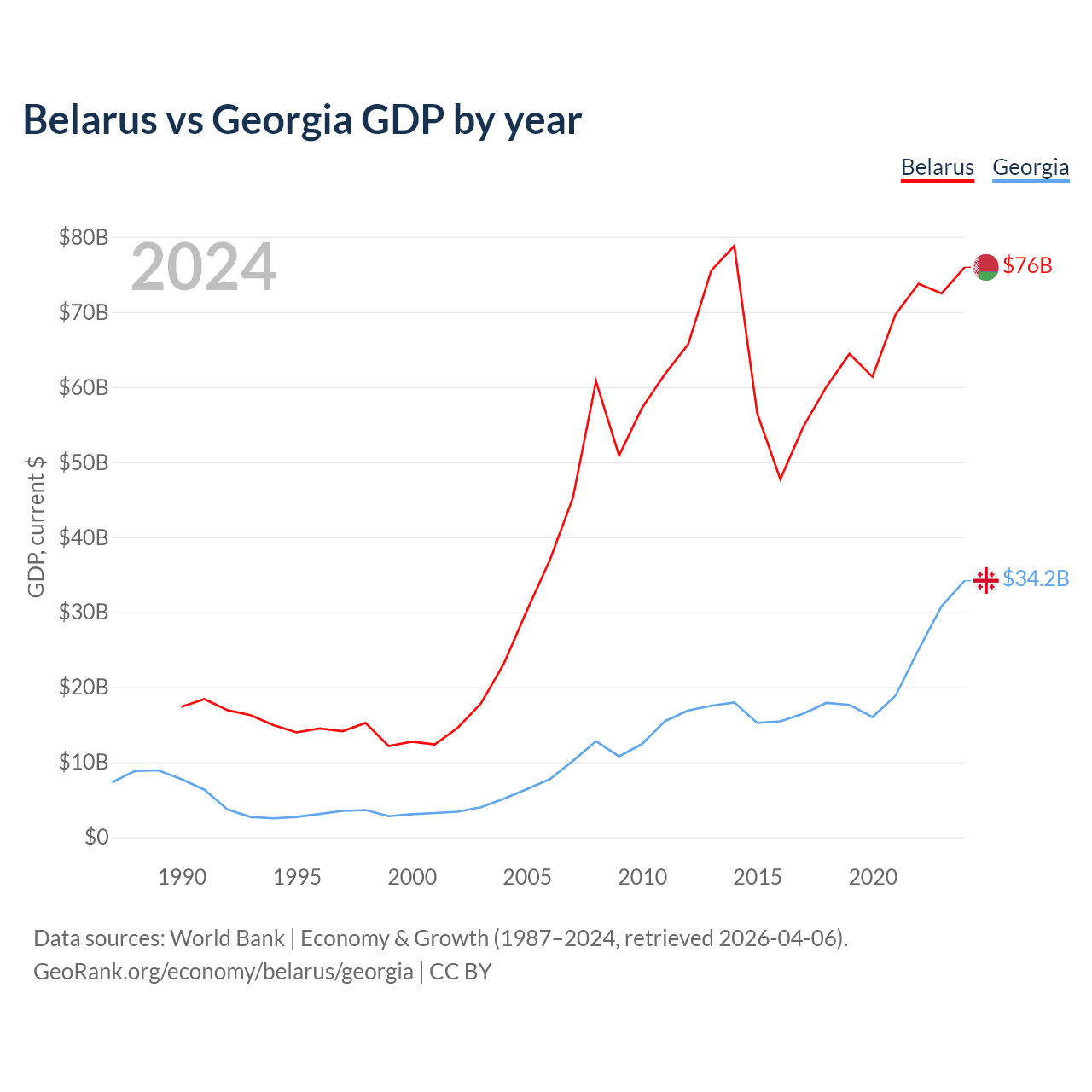 Belarus has a GDP of $76B compared to $34.2B for Georgia, ranking 83/197 and 107/197 by economy size, respectively.