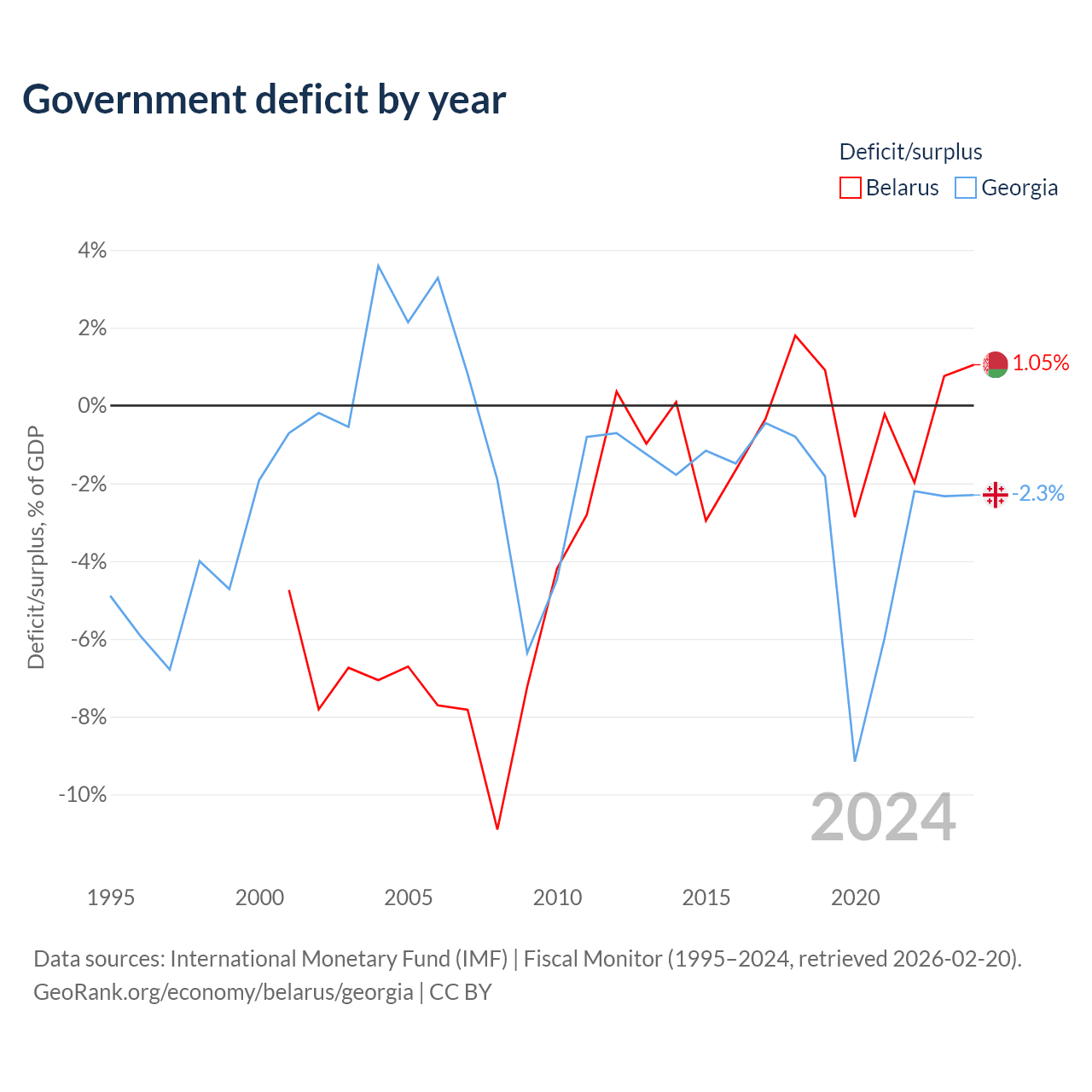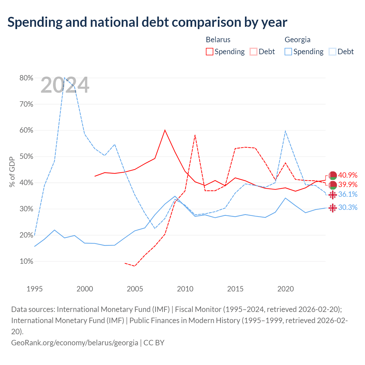 Belarus has $30.3B in government debt (39.9% of GDP), compared to $12.3B (36.1% of GDP) in Georgia.