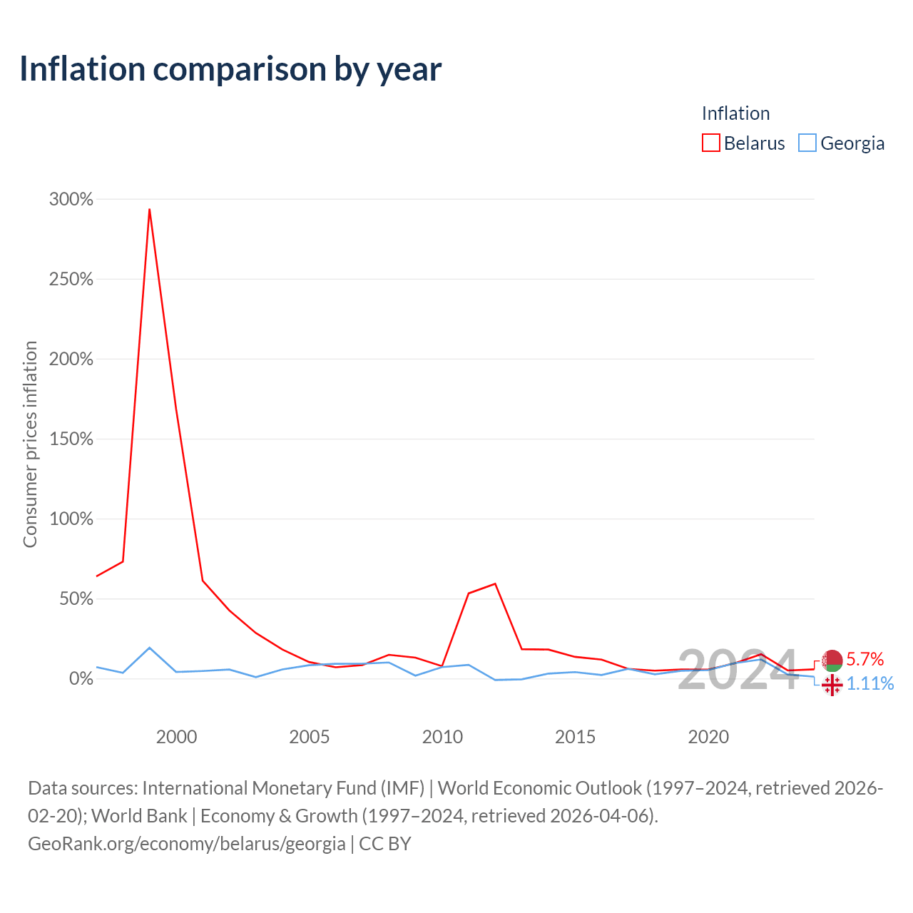 Belarus' GDP per capita is $8,318, ranking 92/197, compared to $9,241 in Georgia, ranking 89/197. Adjusted for purchasing power (GDP per capita PPP), Belarus ranks 68th at $33,010, while Georgia ranks 74th at $28,285.