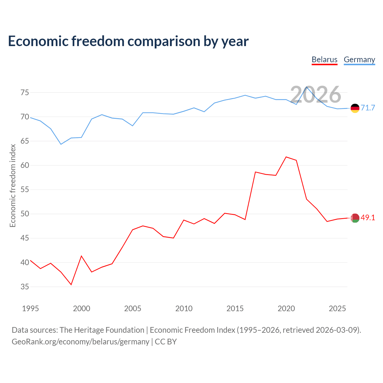 The Economic Freedom Index for Belarus is 49.1, ranking 166/197, compared to 71.7 for Germany, ranking 30/197. The chart above displays a comparison of annual changes in economic freedom indexes.
