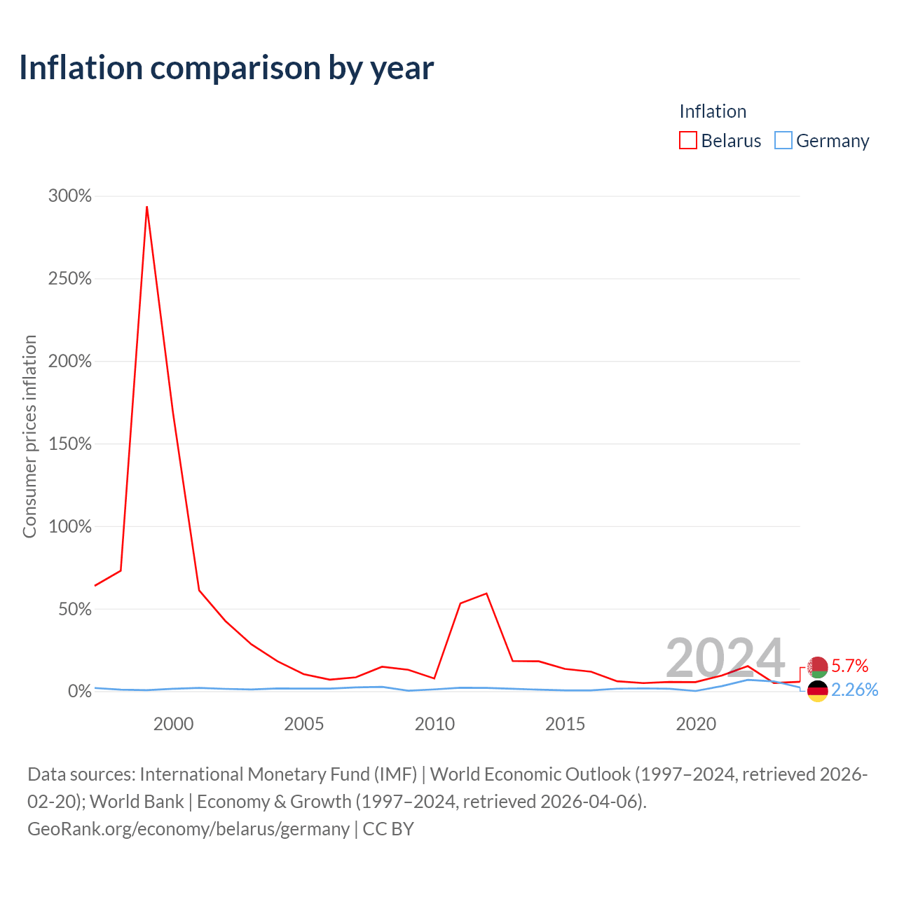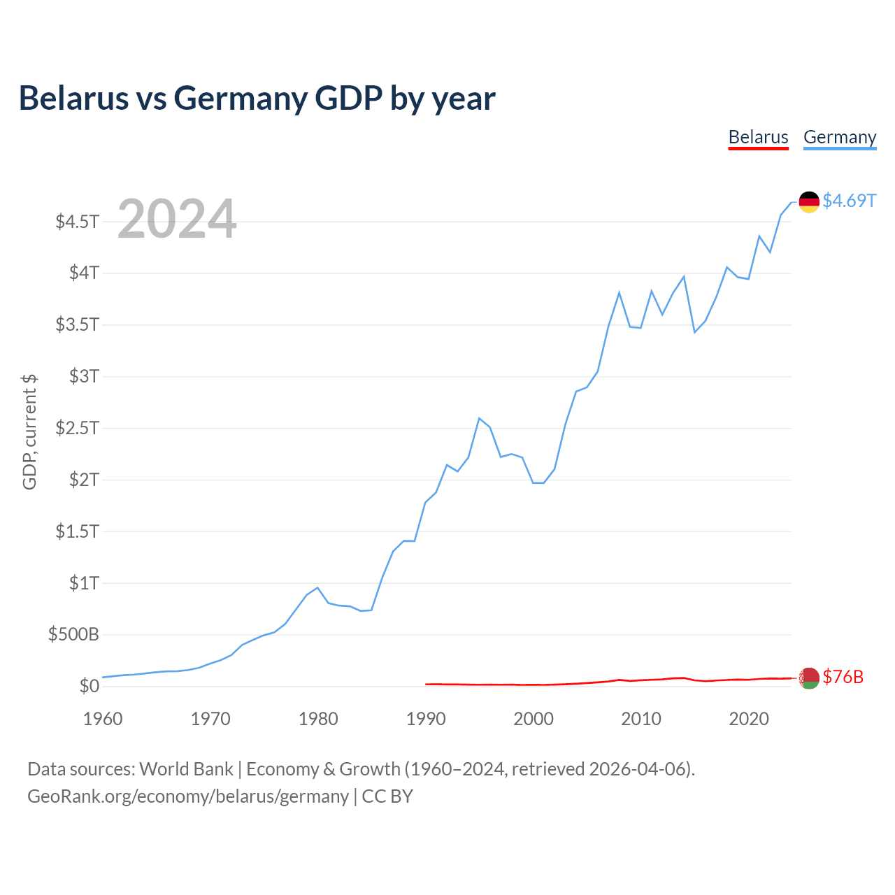 Belarus has a GDP of $76B compared to $4.69T for Germany, ranking 83/197 and 3/197 by economy size, respectively.