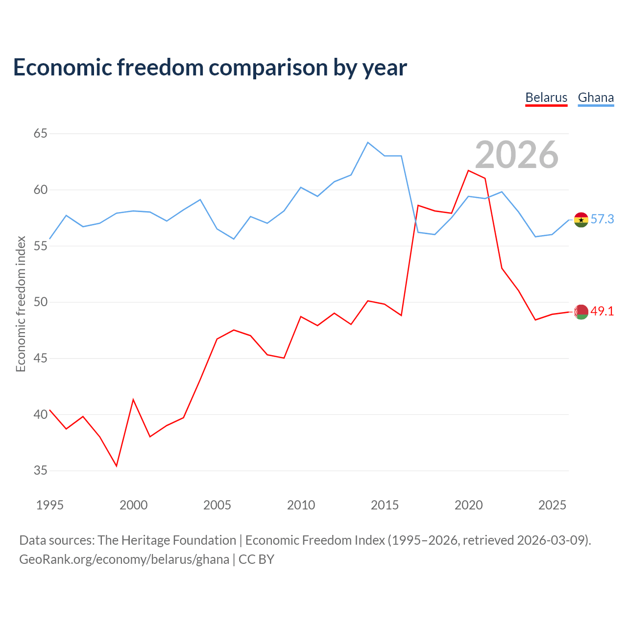 The Economic Freedom Index for Belarus is 49.1, ranking 166/197, compared to 57.3 for Ghana, ranking 118/197. The chart above displays a comparison of annual changes in economic freedom indexes.