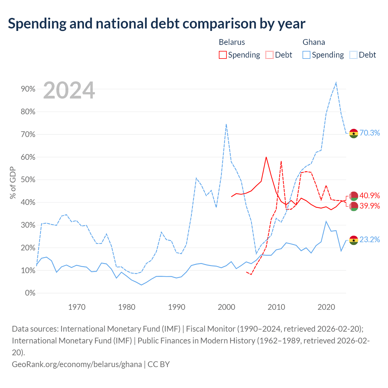 Belarus has $30.3B in government debt (39.9% of GDP), compared to $57.9B (70.3% of GDP) in Ghana.