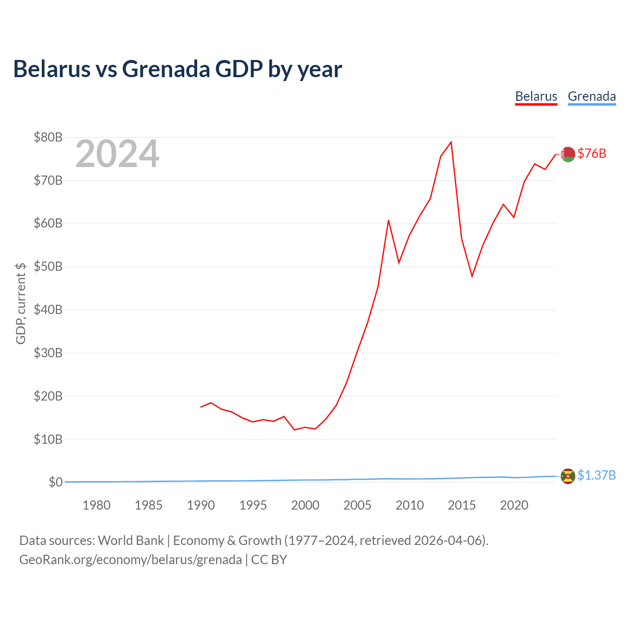 Belarus has a GDP of $76B compared to $1.37B for Grenada, ranking 83/197 and 184/197 by economy size, respectively.