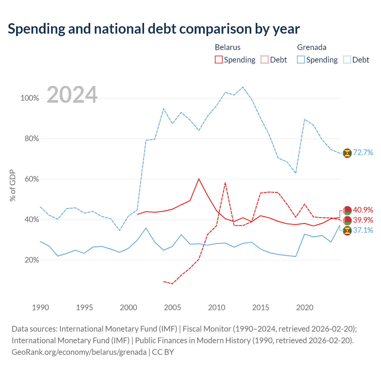 Belarus has $30.3B in government debt (39.9% of GDP), compared to $997M (72.7% of GDP) in Grenada.