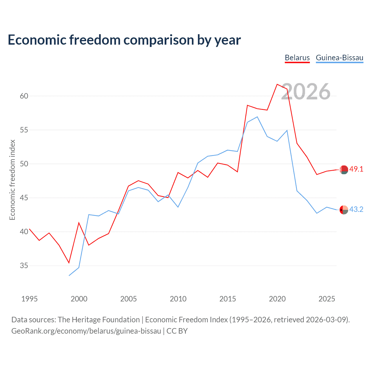 The Economic Freedom Index for Belarus is 49.1, ranking 166/197, compared to 43.2 for Guinea-Bissau, ranking 181/197. The chart above displays a comparison of annual changes in economic freedom indexes.