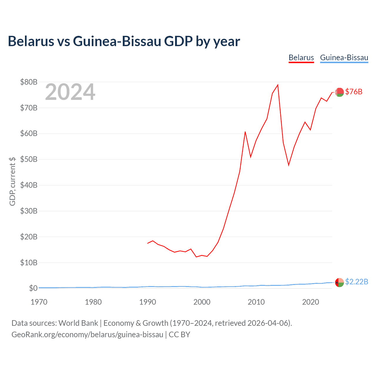 Belarus has a GDP of $76B compared to $2.22B for Guinea-Bissau, ranking 83/197 and 176/197 by economy size, respectively.