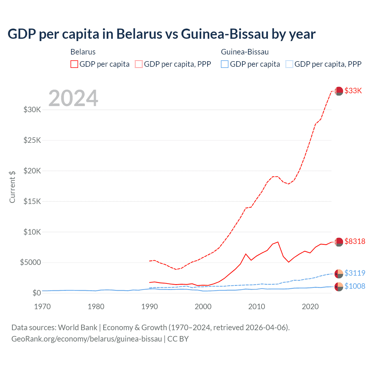 GDP per capita in Belarus vs Guinea-Bissau by year