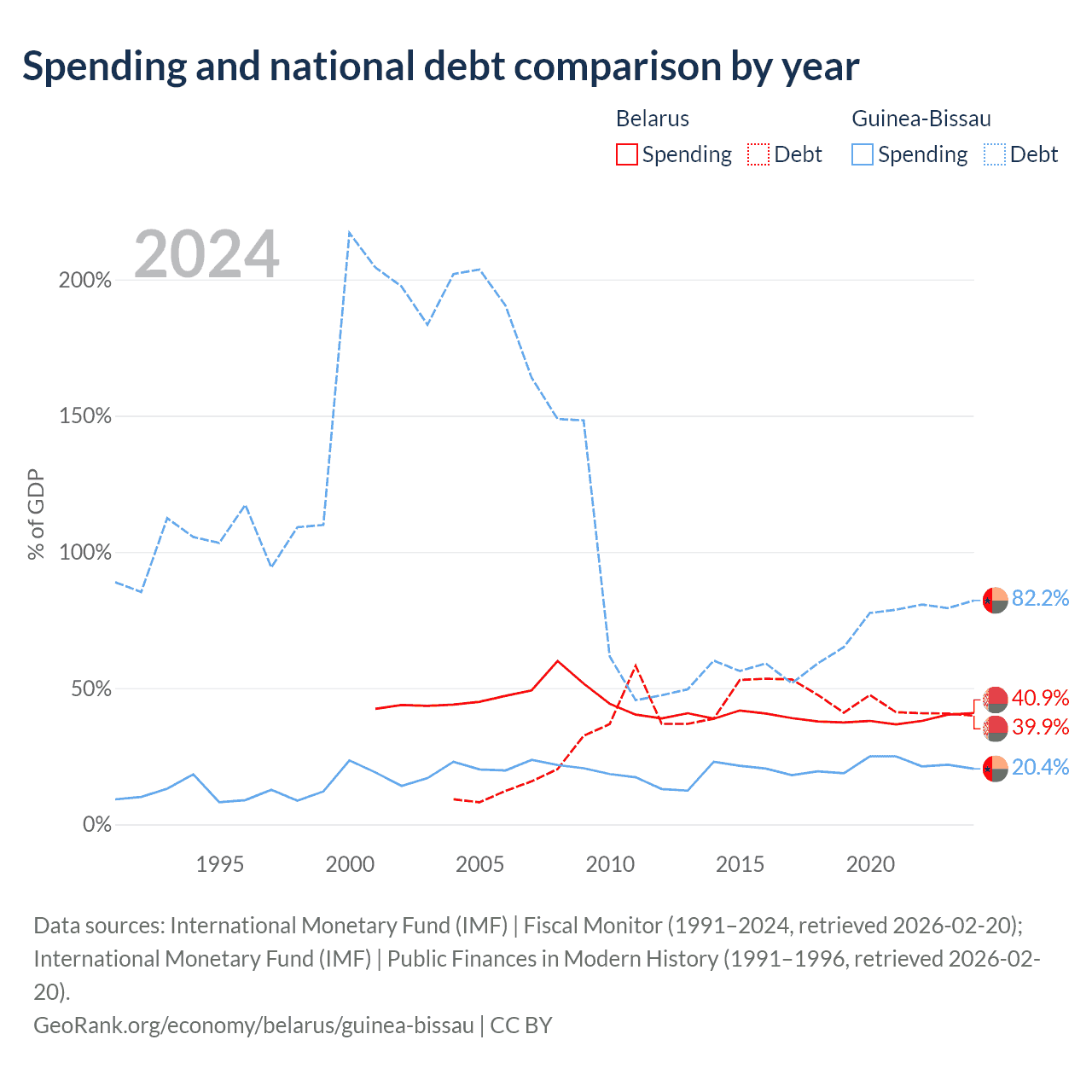 Belarus has $30.3B in government debt (39.9% of GDP), compared to $1.82B (82.2% of GDP) in Guinea-Bissau.