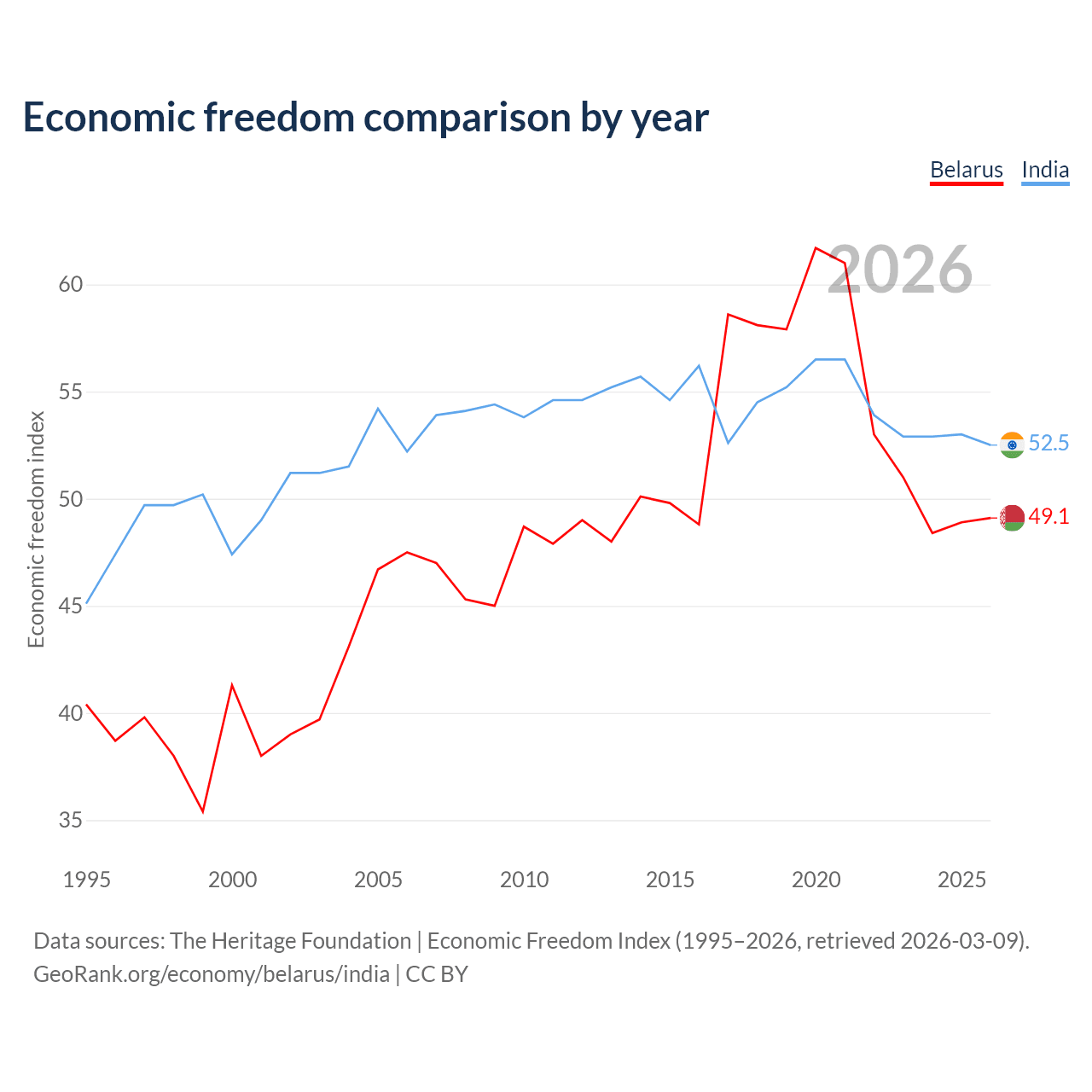 The Economic Freedom Index for Belarus is 49.1, ranking 166/197, compared to 52.5 for India, ranking 146/197. The chart above displays a comparison of annual changes in economic freedom indexes.