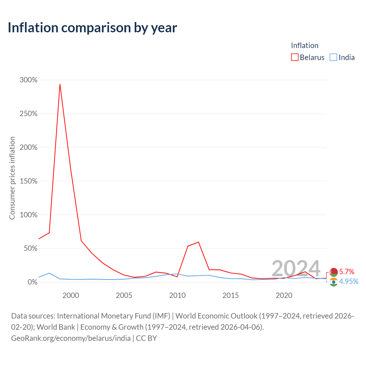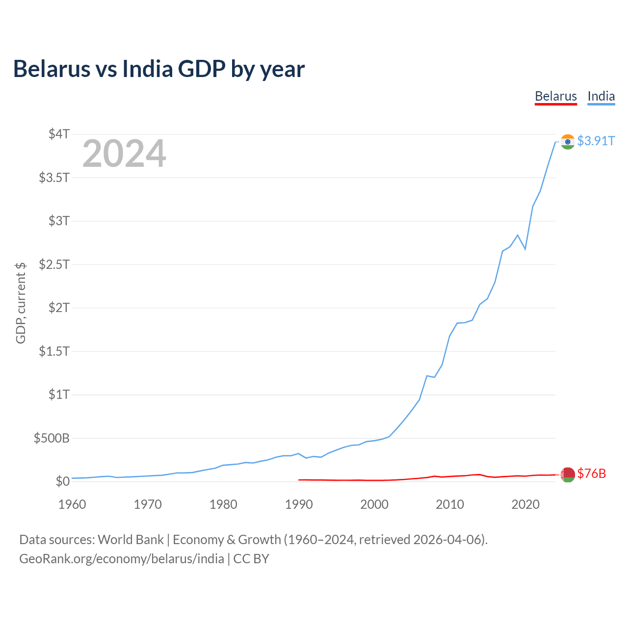 Belarus has a GDP of $76B compared to $3.91T for India, ranking 83/197 and 5/197 by economy size, respectively.