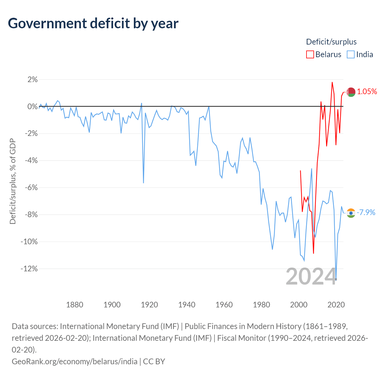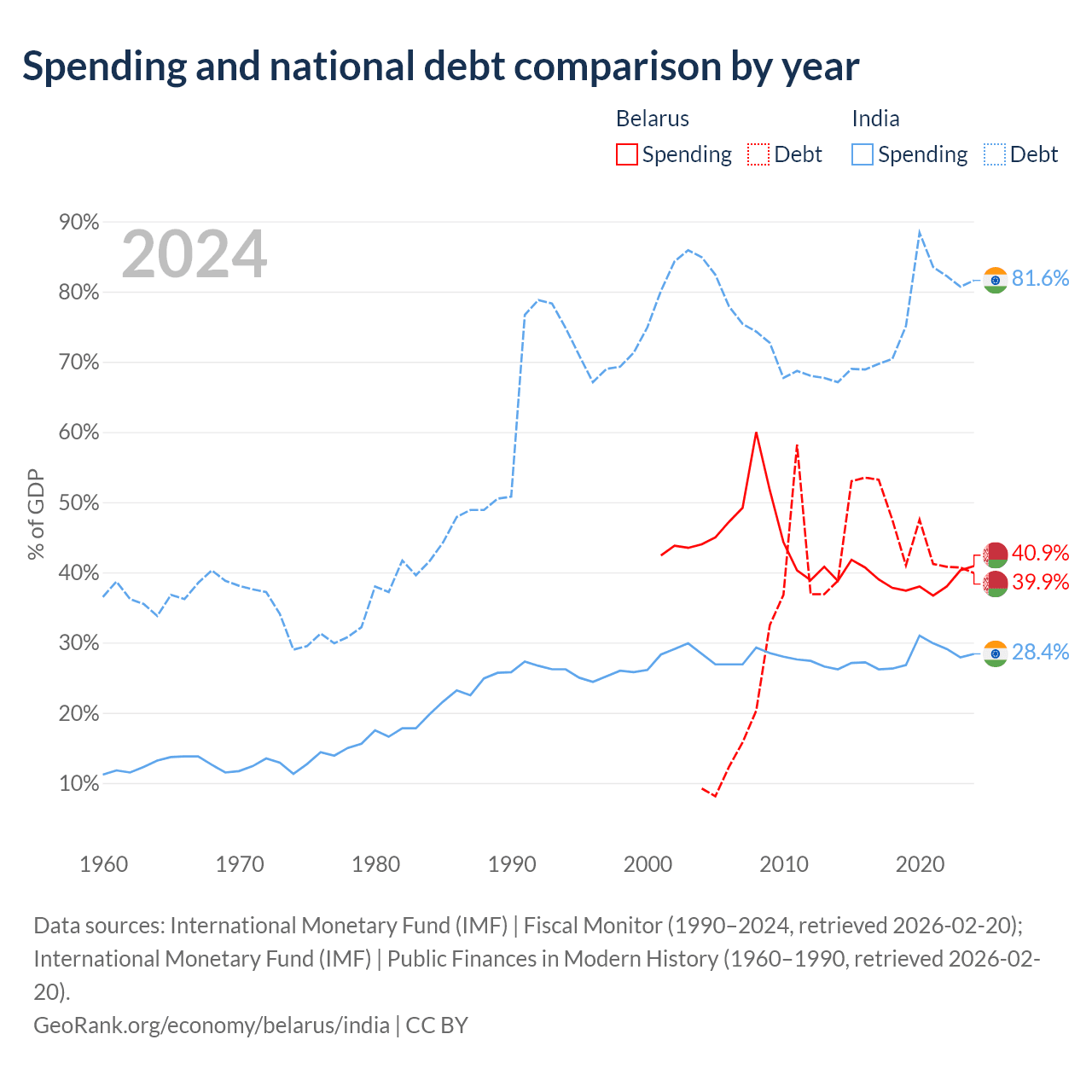 Belarus has $30.3B in government debt (39.9% of GDP), compared to $3.19T (81.6% of GDP) in India.