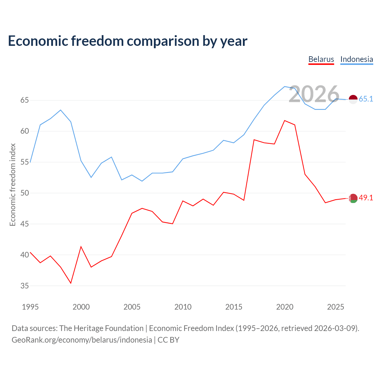 The Economic Freedom Index for Belarus is 49.1, ranking 166/197, compared to 65.1 for Indonesia, ranking 67/197. The chart above displays a comparison of annual changes in economic freedom indexes.