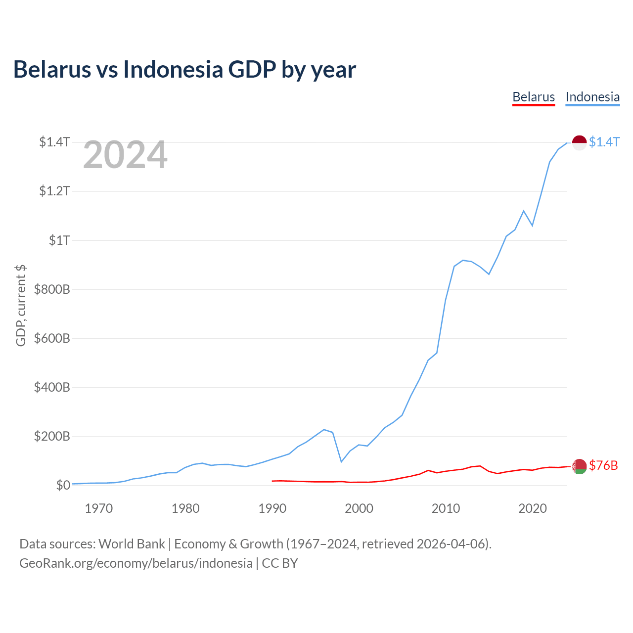 Belarus has a GDP of $76B compared to $1.4T for Indonesia, ranking 83/197 and 16/197 by economy size, respectively.
