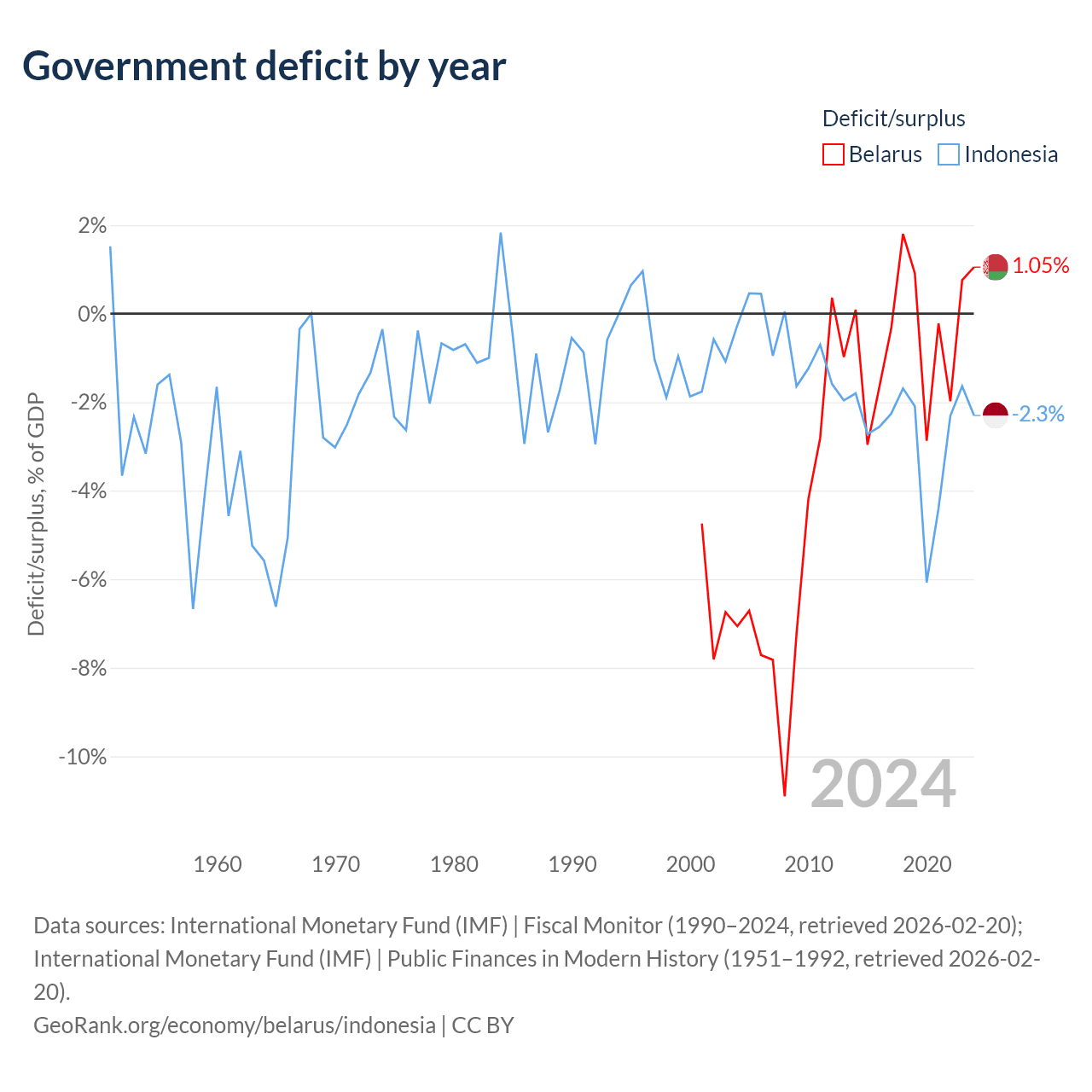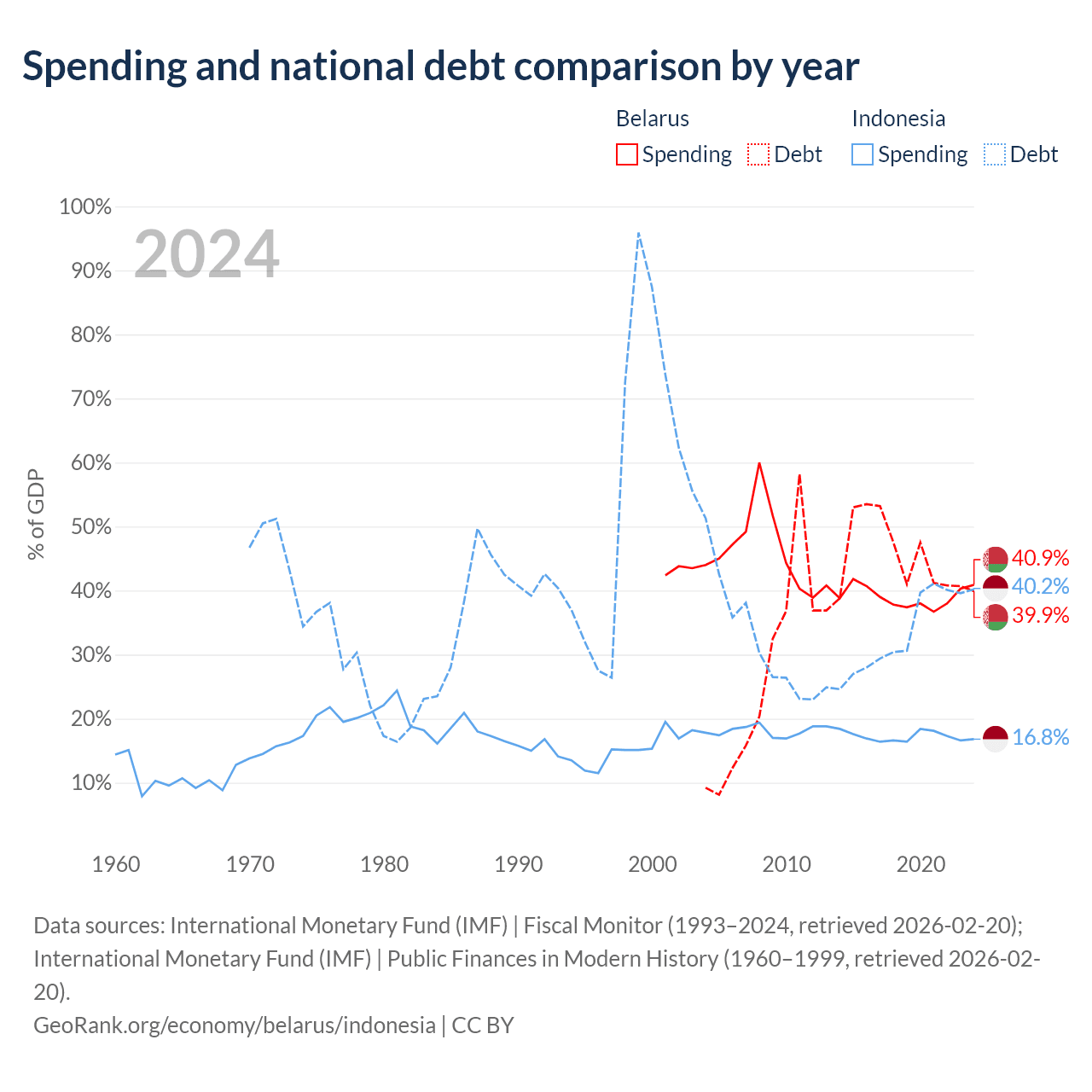 Belarus has $30.3B in government debt (39.9% of GDP), compared to $561B (40.2% of GDP) in Indonesia.