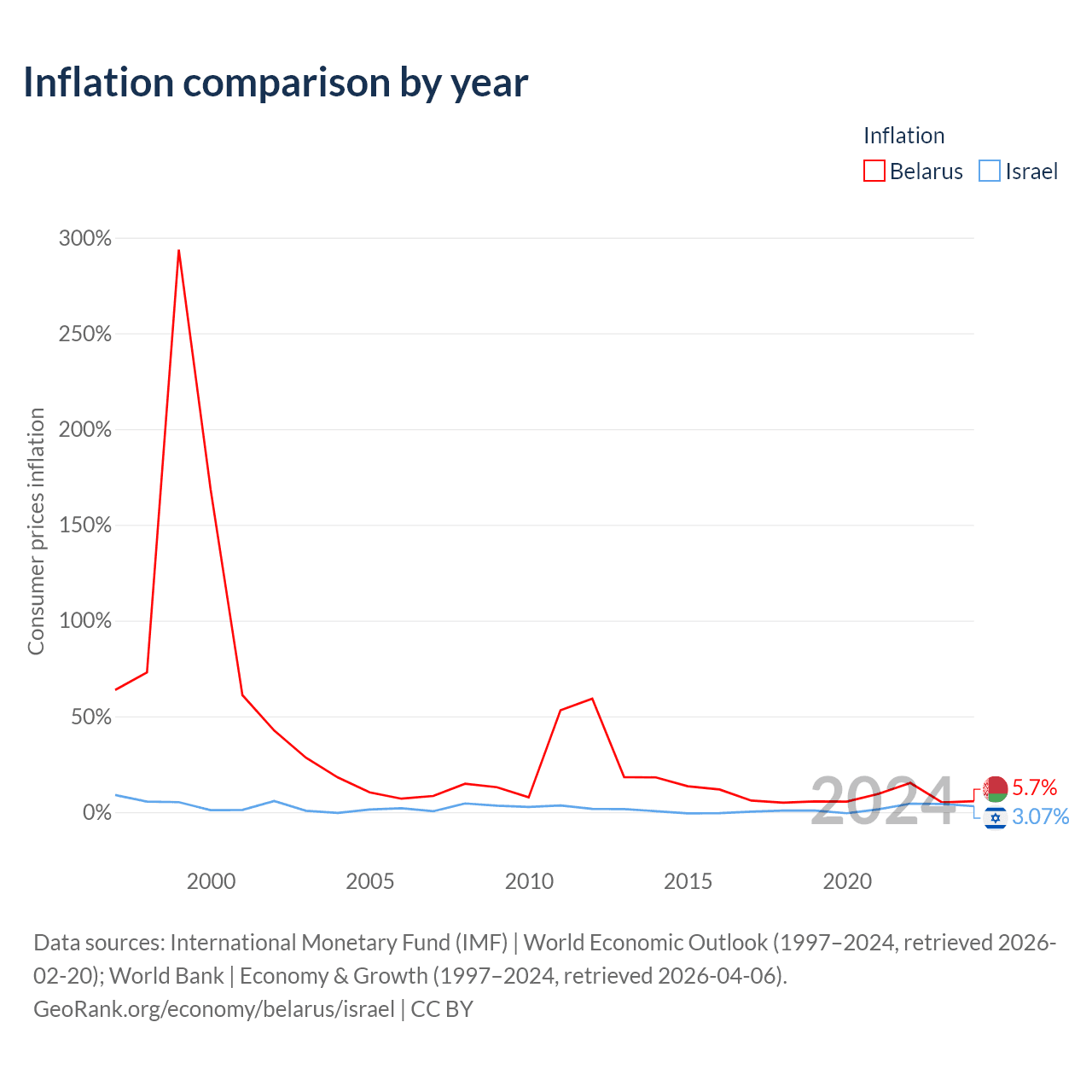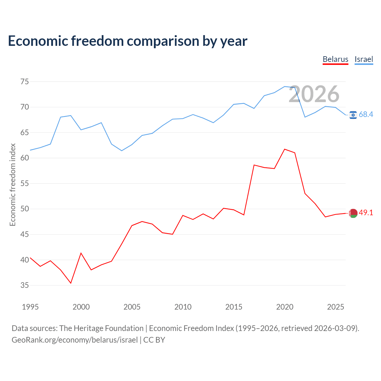 The Economic Freedom Index for Belarus is 49.1, ranking 166/197, compared to 68.4 for Israel, ranking 47/197. The chart above displays a comparison of annual changes in economic freedom indexes.
