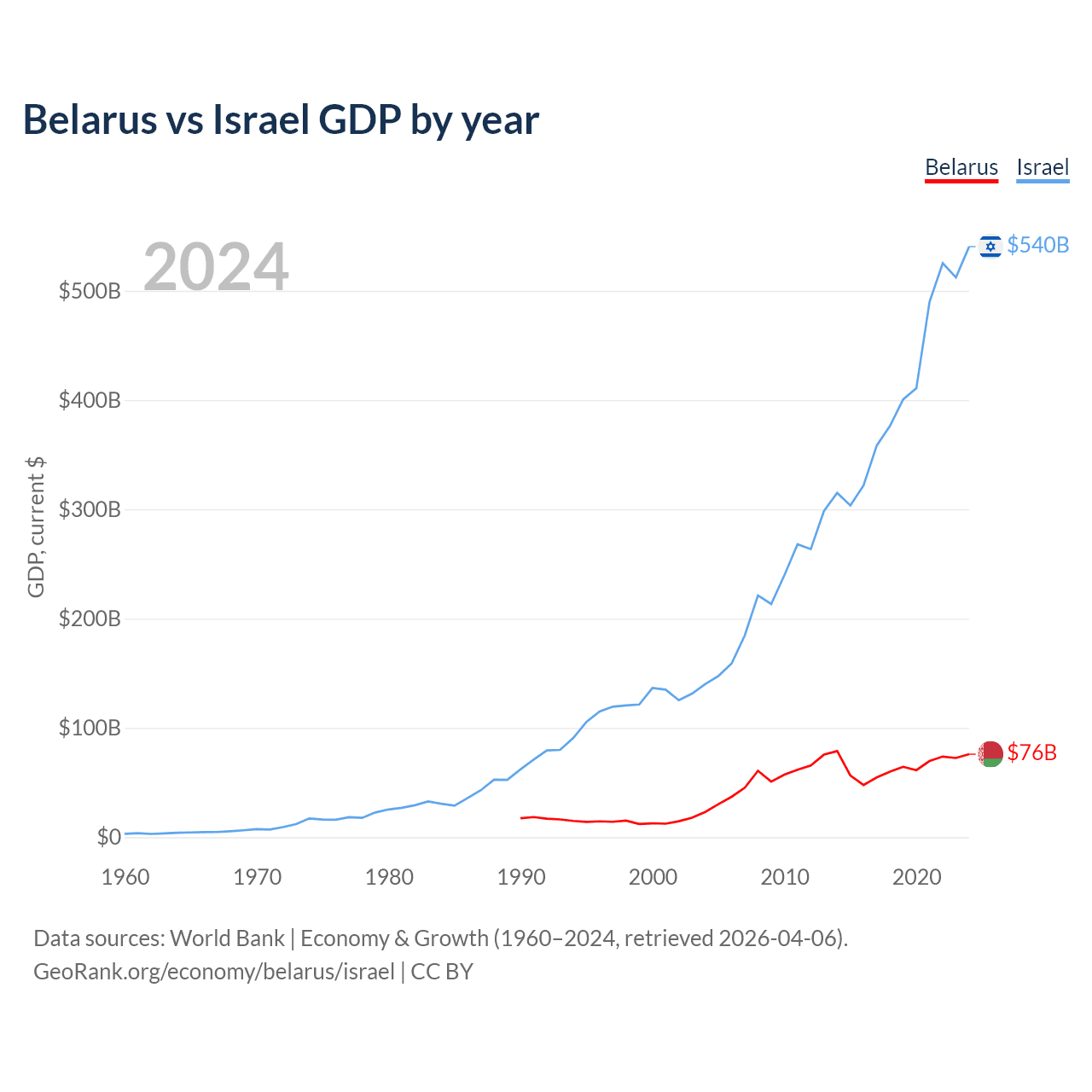 Belarus has a GDP of $76B compared to $540B for Israel, ranking 83/197 and 29/197 by economy size, respectively.