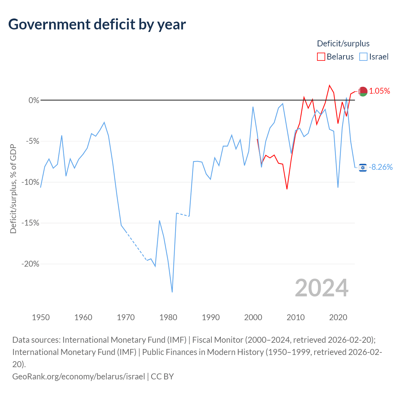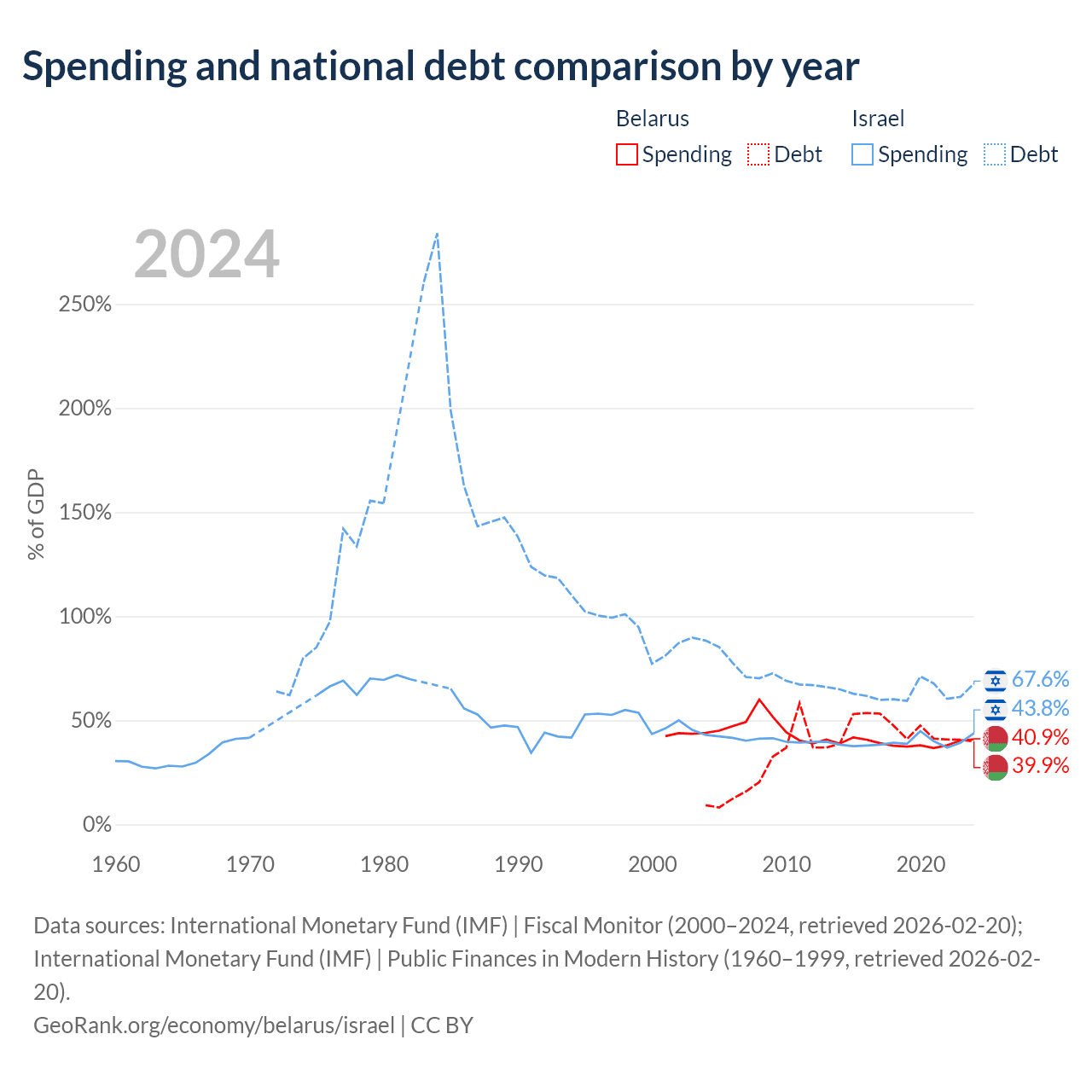 Belarus has $30.3B in government debt (39.9% of GDP), compared to $366B (67.6% of GDP) in Israel.