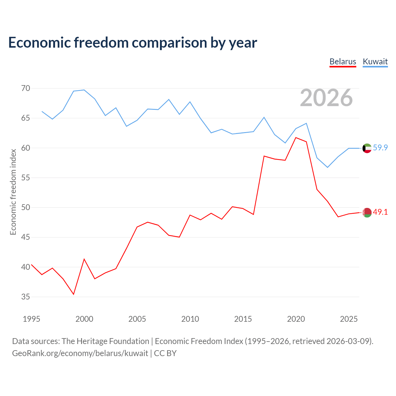 The Economic Freedom Index for Belarus is 49.1, ranking 166/197, compared to 59.9 for Kuwait, ranking 100/197. The chart above displays a comparison of annual changes in economic freedom indexes.