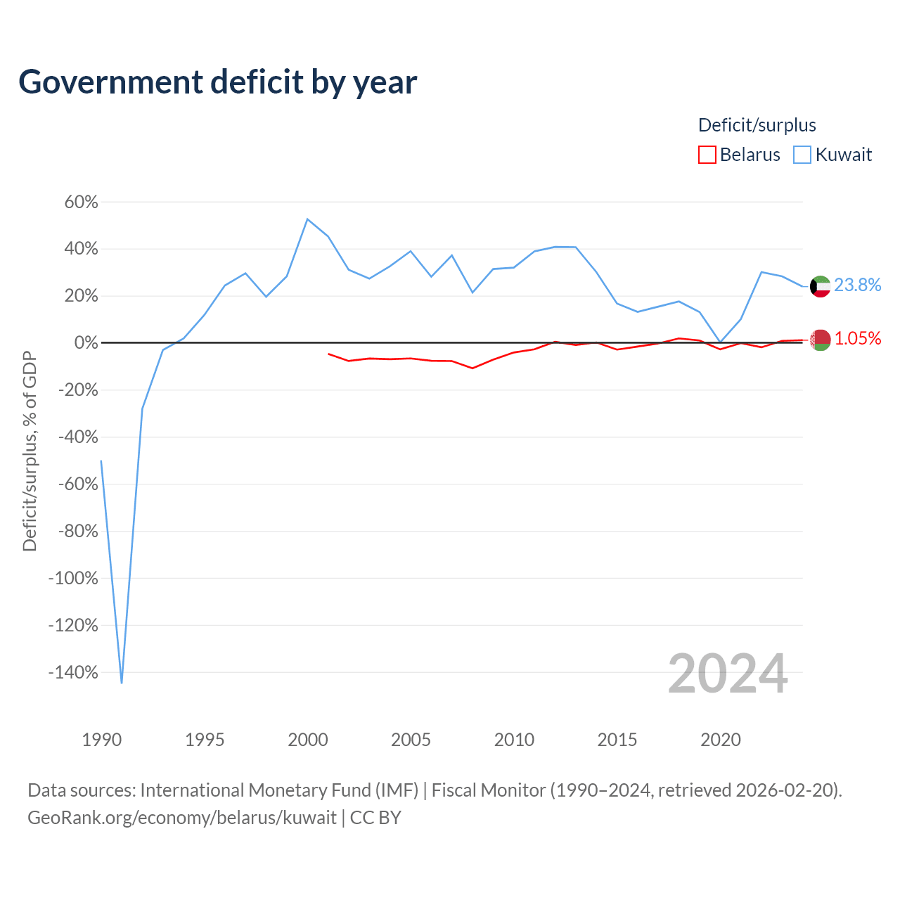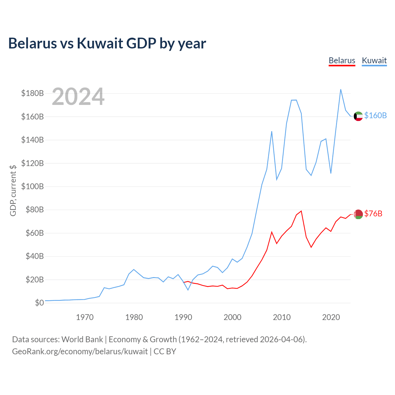 Belarus has a GDP of $76B compared to $160B for Kuwait, ranking 83/197 and 59/197 by economy size, respectively.