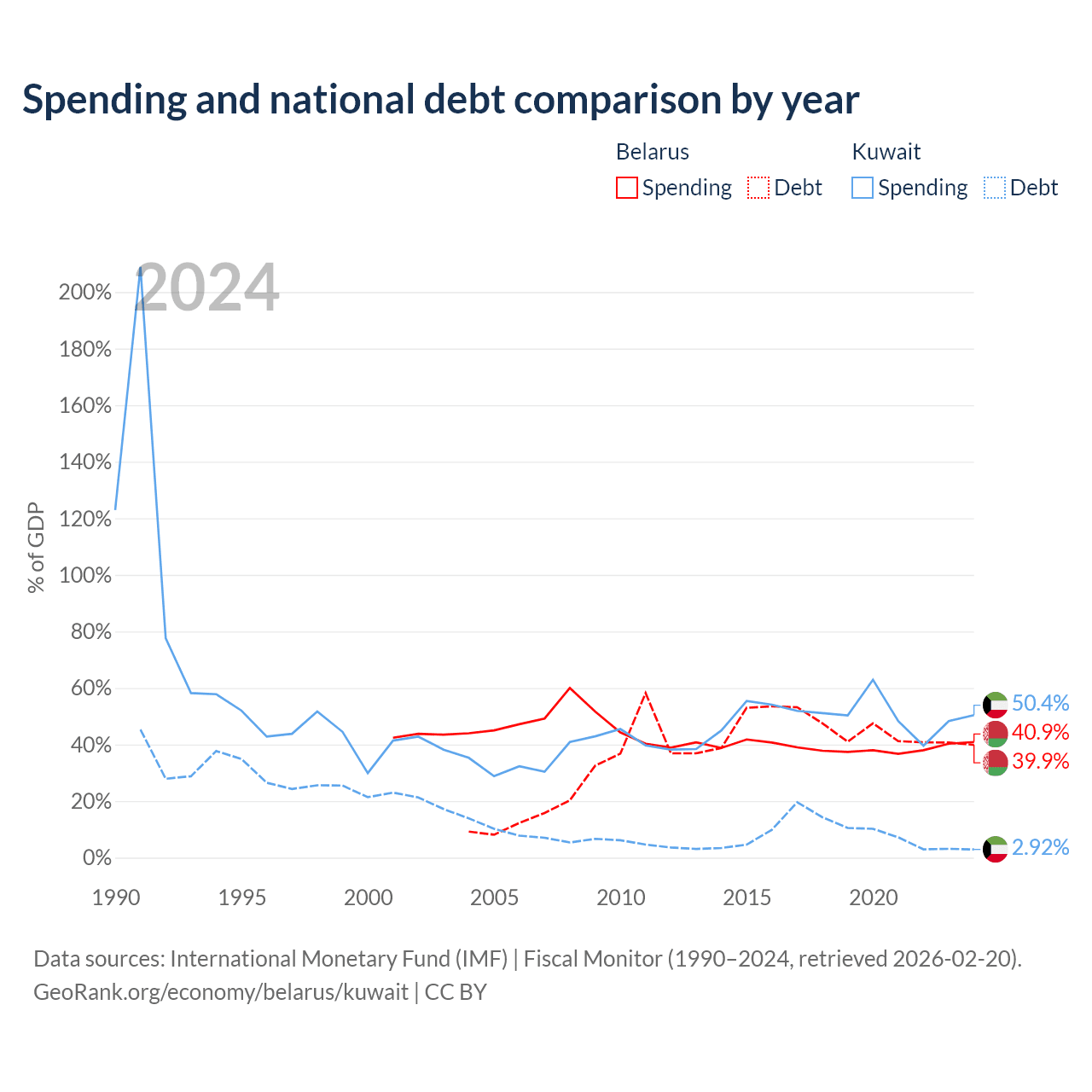 Belarus has $30.3B in government debt (39.9% of GDP), compared to $4.68B (2.92% of GDP) in Kuwait.