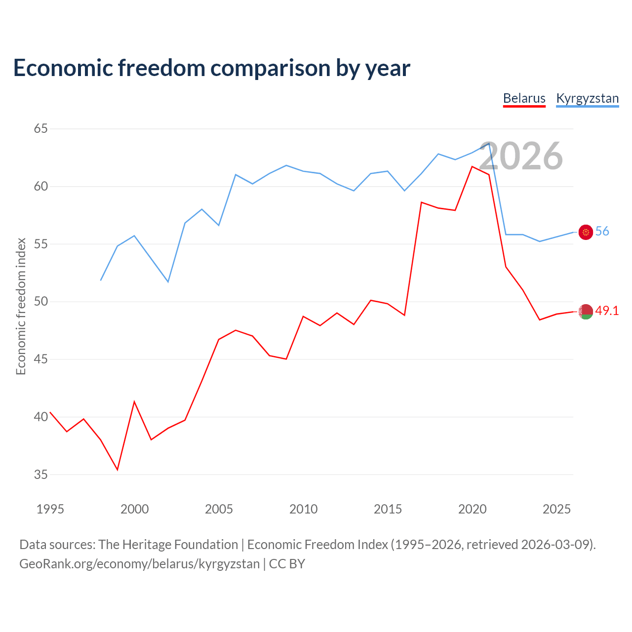 The Economic Freedom Index for Belarus is 49.1, ranking 166/197, compared to 56 for Kyrgyzstan, ranking 126/197. The chart above displays a comparison of annual changes in economic freedom indexes.