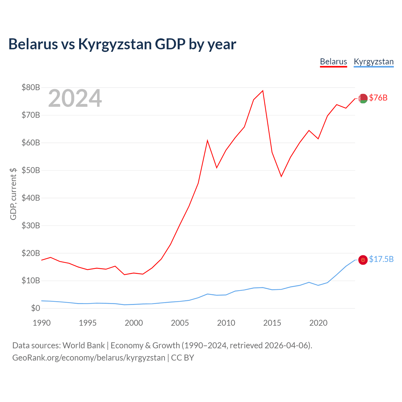 Belarus has a GDP of $76B compared to $17.5B for Kyrgyzstan, ranking 83/197 and 135/197 by economy size, respectively.