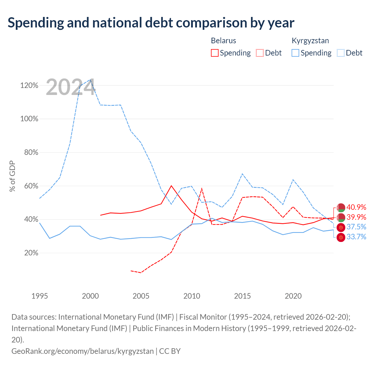 Belarus has $30.3B in government debt (39.9% of GDP), compared to $6.56B (37.5% of GDP) in Kyrgyzstan.