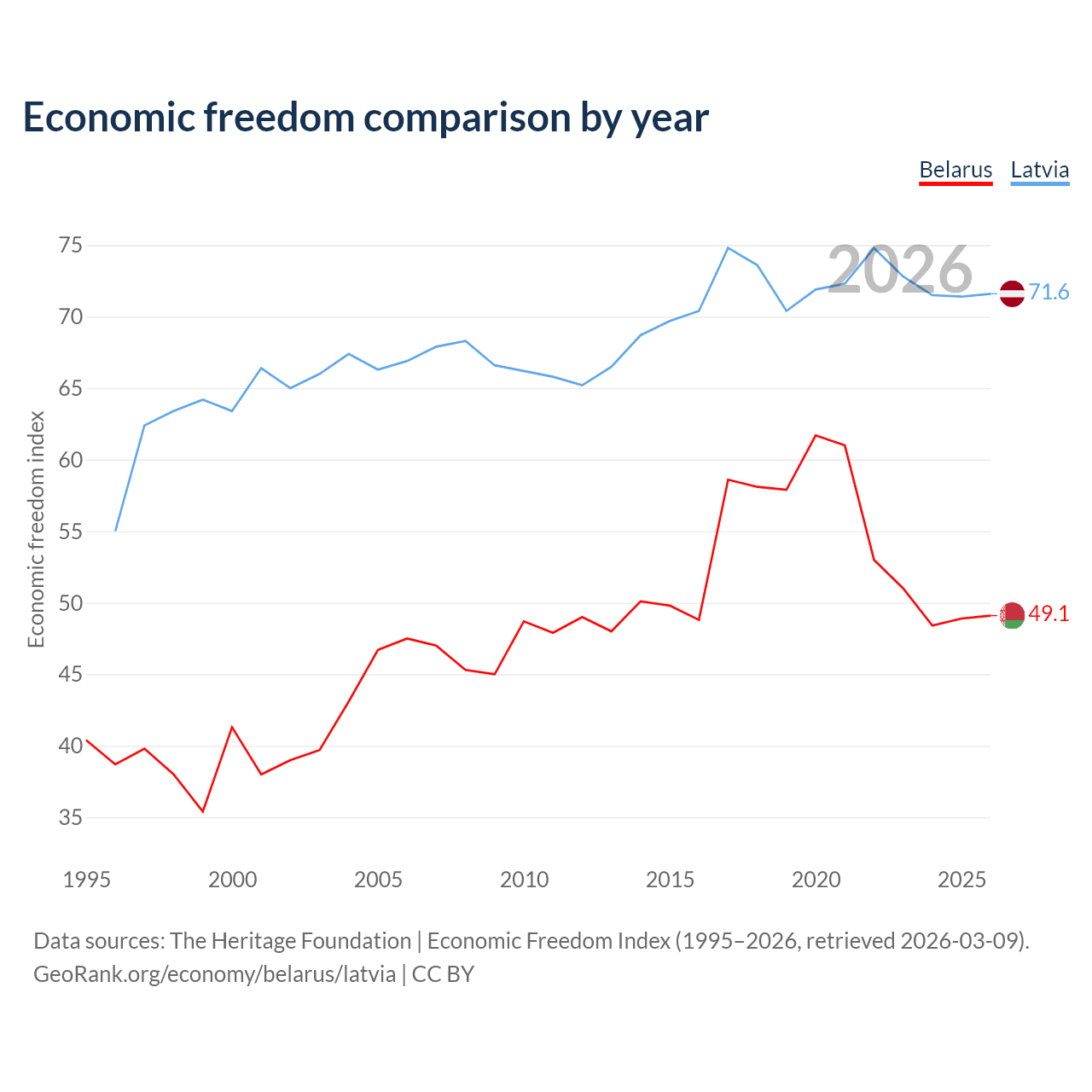 The Economic Freedom Index for Belarus is 49.1, ranking 166/197, compared to 71.6 for Latvia, ranking 31/197. The chart above displays a comparison of annual changes in economic freedom indexes.
