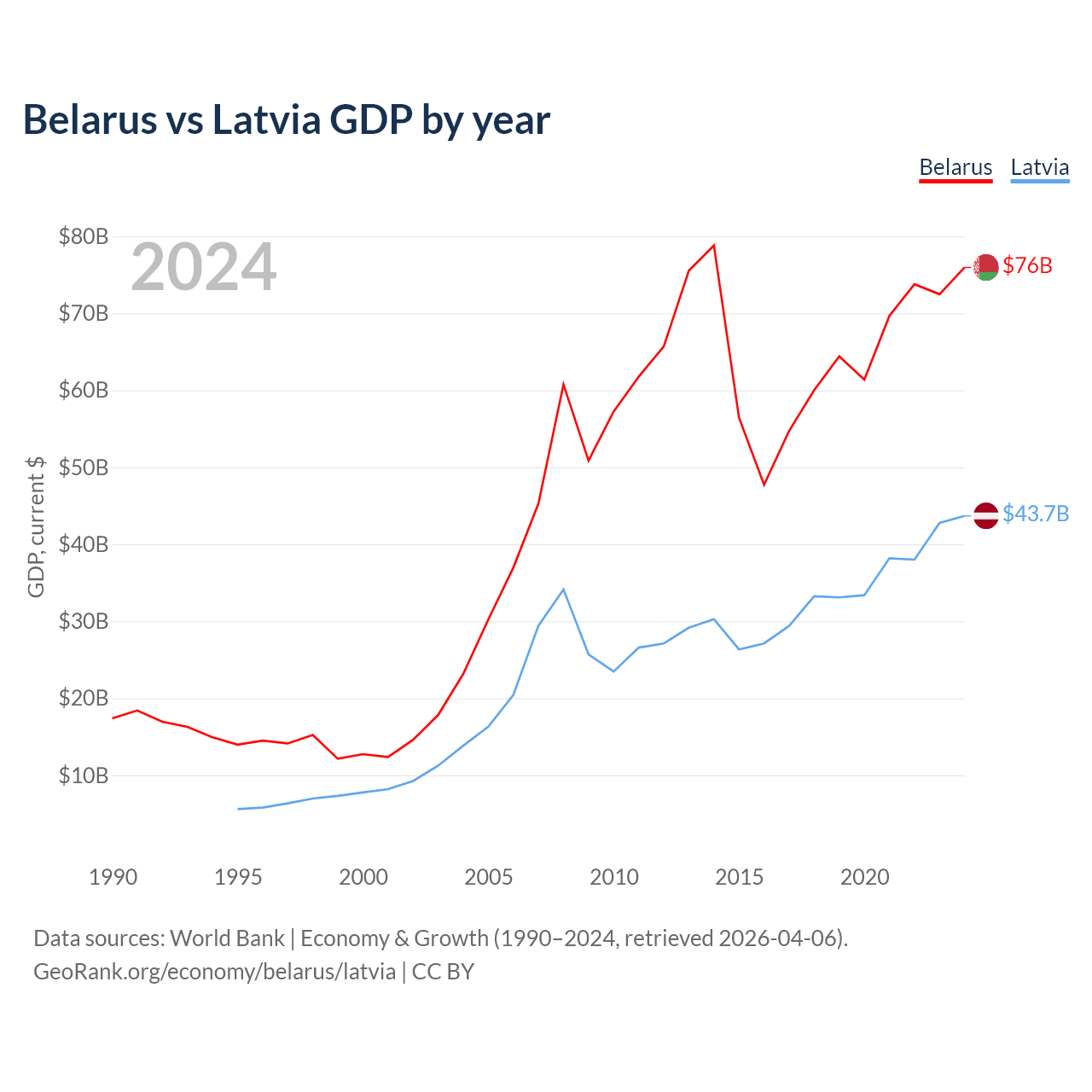Belarus vs Latvia GDP by year