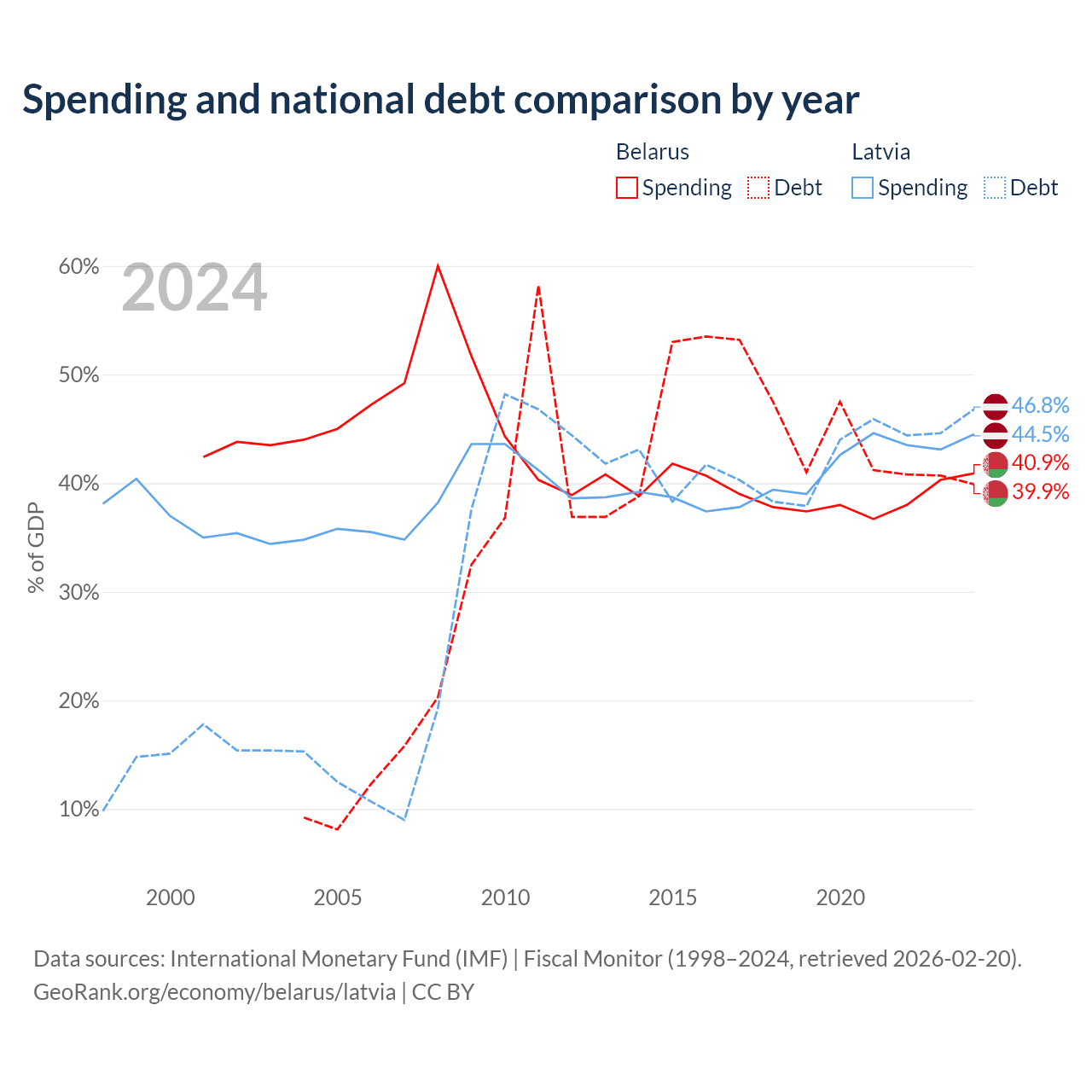 Belarus has $30.3B in government debt (39.9% of GDP), compared to $20.4B (46.8% of GDP) in Latvia.